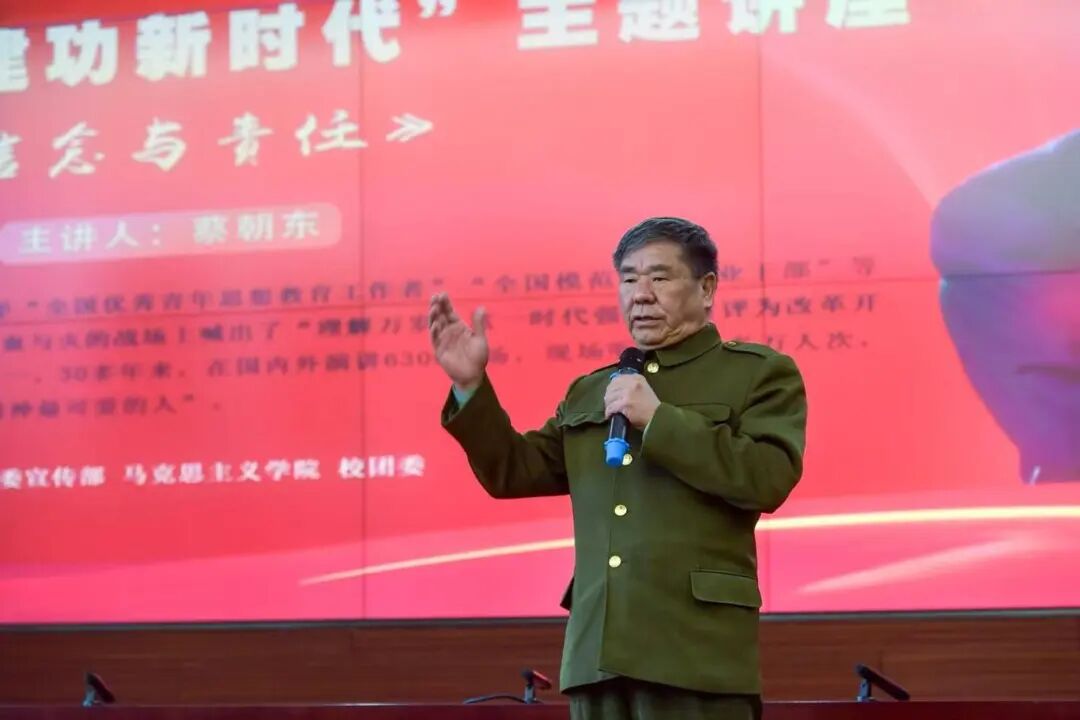 报告中,蔡朝东结合自己参加对越自卫反击战、基层任职等亲身经历和对社会生活的观察思考,用一个个战场上鲜活的英雄事迹、一次次看望退伍老兵和烈士家属的影像纪实、一件件基层工作中的小事实事,深刻阐述了“国家至上、人民至上、奉献至上”的价值观念和“苦了我一人、幸福十亿人”的老山精神内涵,分享了关于坚定理想信念、勇担家国责任的感悟和体会,诠释了理想、信念、忠孝、责任对实现人生价值的重要性,并号召广大师生向英模看齐,在“比信念、比责任、比艰苦、比奉献”中砥砺前行。