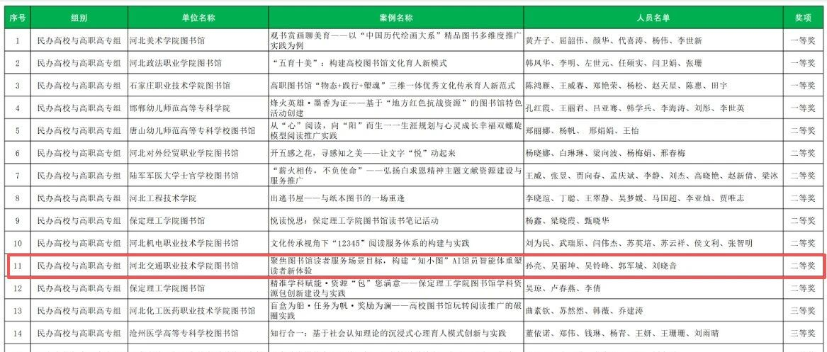 11月3日-5日,河北省教育厅主办、河北大学及河北省高等学校图书情报工作委员会承办的第八届河北省高校图书馆服务创新案例大赛决赛落下帷幕。本次大赛以“智慧·协同·未来:面向‘十五五’的高校图书馆新篇章”为主题,初赛评选出25项案例进入决赛,河北交通职业技术学院图书馆申报的案例《聚焦图书馆读者服务场景目标,构建“知小图”AI馆员智能体重塑读者新体验》荣获民办院校与高职高专组二等奖。