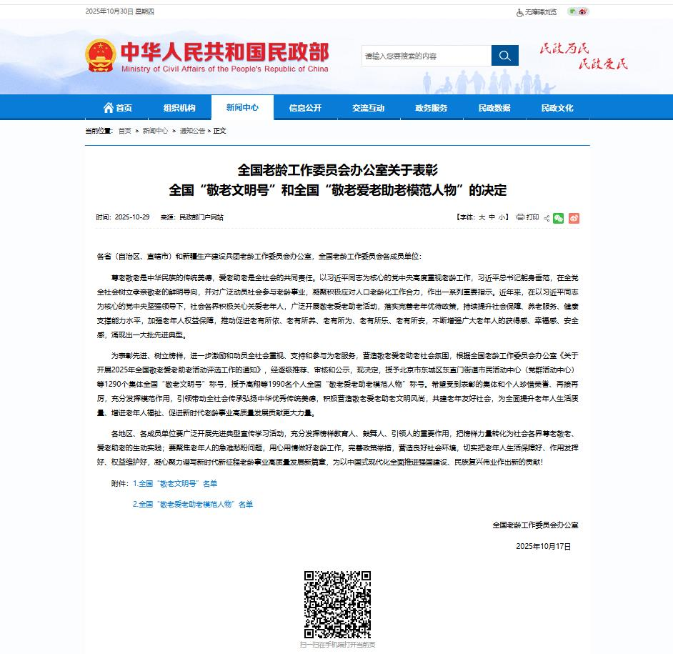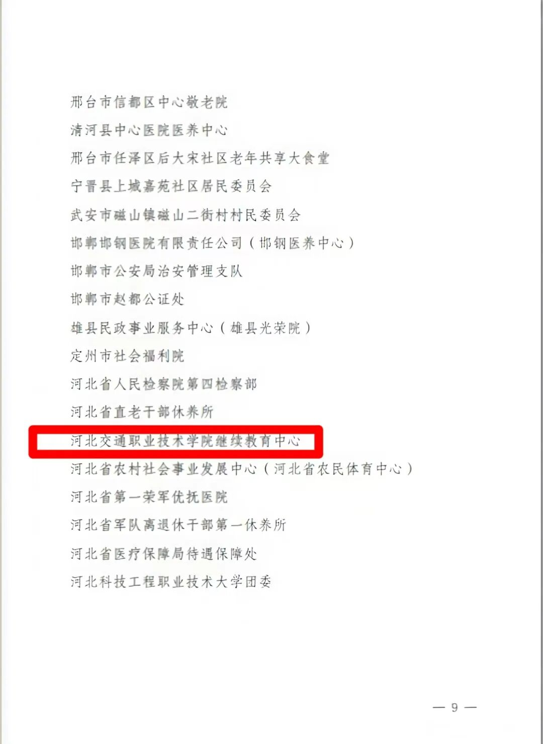 近日,全国老龄工作委员会办公室发布《关于表彰全国“敬老文明号”和全国“敬老爱老助老模范人物”的决定》,授予北京市东城区东直门街道市民活动中心(党群活动中心)等1290个集体全国“敬老文明号”称号、授予高翔等1990名个人全国“敬老爱老助老模范人物”称号,其中,我省53个集体、85名个人获表彰! 经择优评选、逐级推报,河北交通职业技术学院继续教育中心被评选为全国“敬老文明号”。