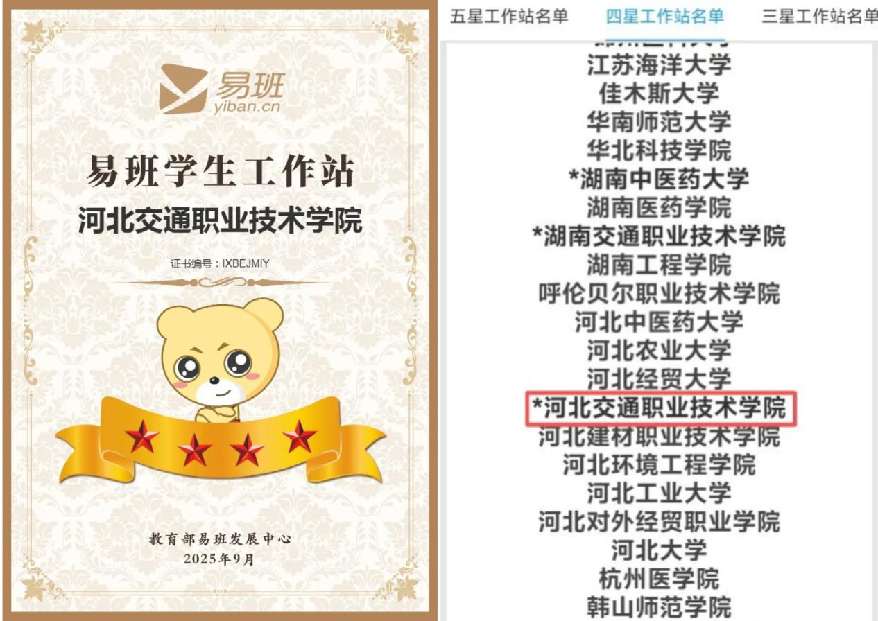 近日,教育部易班发展中心公布了2025年度全国高校易班学生工作站的“星级”评选结果,河北交通职业技术学院易班学生工作站被评为“全国四星易班工作站”。这一荣誉是对我院易班建行的丰硕成果。
