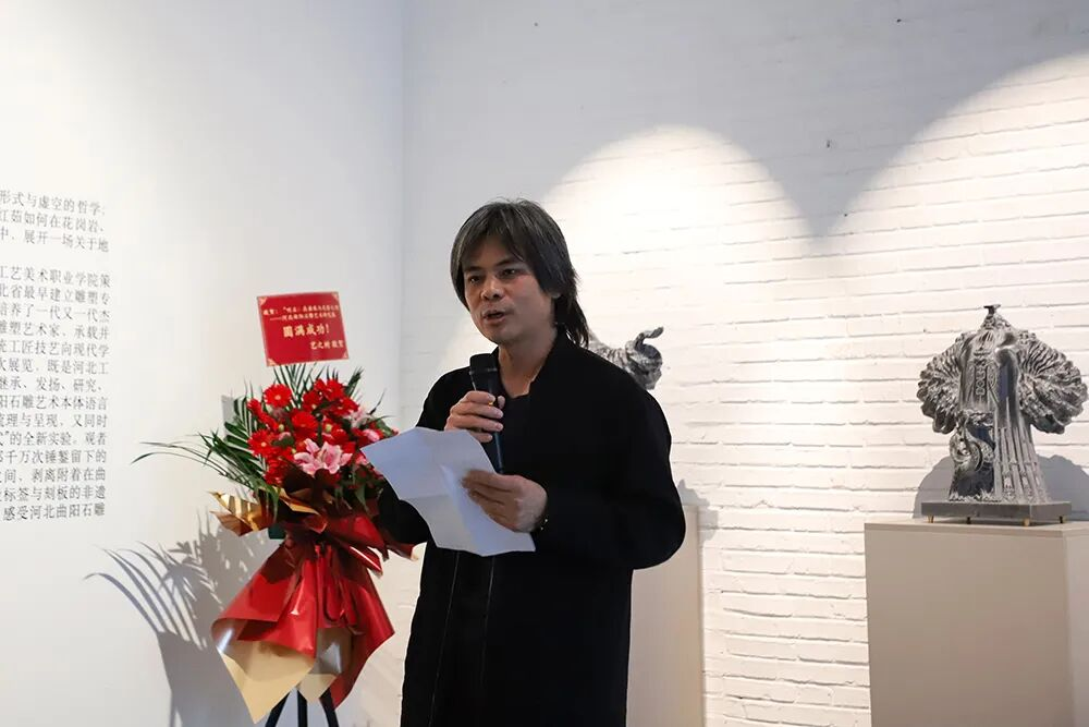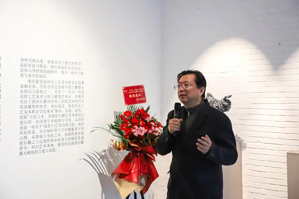 才大颖对展览成功举办表示祝贺,并表示,这不仅是回归艺术本体的深刻觉醒,更是“产教融合”与“学术引领”的成功实践,为行业转型升级提供了示范。王谞昭在致辞中谈道,此次展览不仅是技艺的展示,更是传统文化与当代审美的深度融合,希望能以此为契机,让更多人关注并重新认识曲阳石雕艺术。高英坡作为参展艺术家代表发言,他分享了在石雕创作中守正创新的体会,表达了对这份古老技艺的敬畏之心以及在当代语境下进行艺术探索的决心。