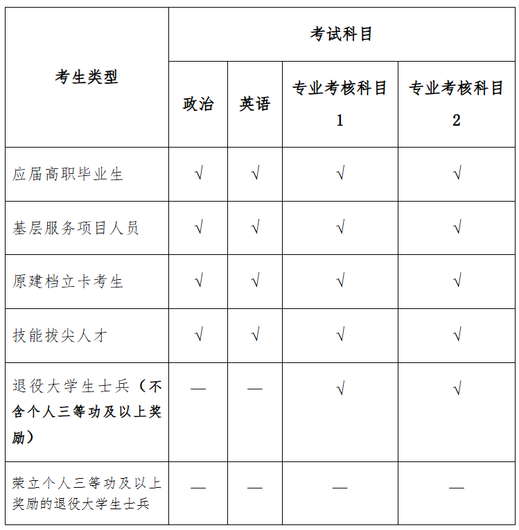 按照《河北省教育厅关于优化调整河北省普通专升本考试科类及科目设置的通知》(冀教学〔2023〕19 号)要求,普通专升本考试科目设公共文化考试和专业综合(职业适应性)考核(简称“专业综合考核”,下同)两部分,总分500分。公共文化考试包含政治、英语2个科目,每科目满分100分。专业综合考核包含专业考核科目1和专业考核科目2(详见上述通知附件2),每科目满分150分。各类考生具体考试科目如下(‘√’表示需要参加考试,‘—’表示免试):