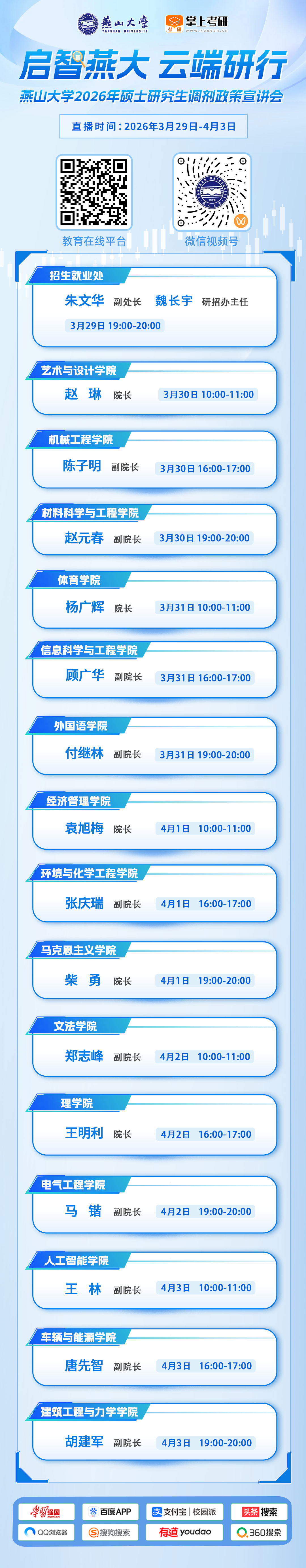 为帮助广大考研调剂考生全面、准确掌握燕山大学研究生招生政策、调剂缺额信息及复试相关安排,燕山大学特携手掌上考研,正式开启2026年硕士研究生调剂政策宣讲会,直播时间定于2026年3月29日—4月3日。