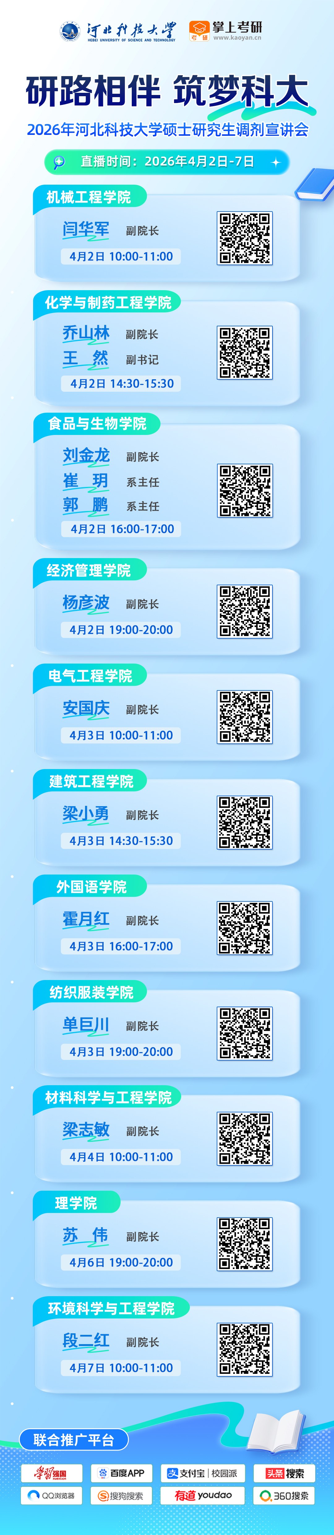 为帮助广大考研调剂考生全面、准确掌握河北科技大学研究生招生政策、调剂缺额信息及复试相关安排,河北科技大学特携手掌上考研,正式开启2026年硕士研究生调剂政策会,直播时间定于2026年4月2日—4月7日。