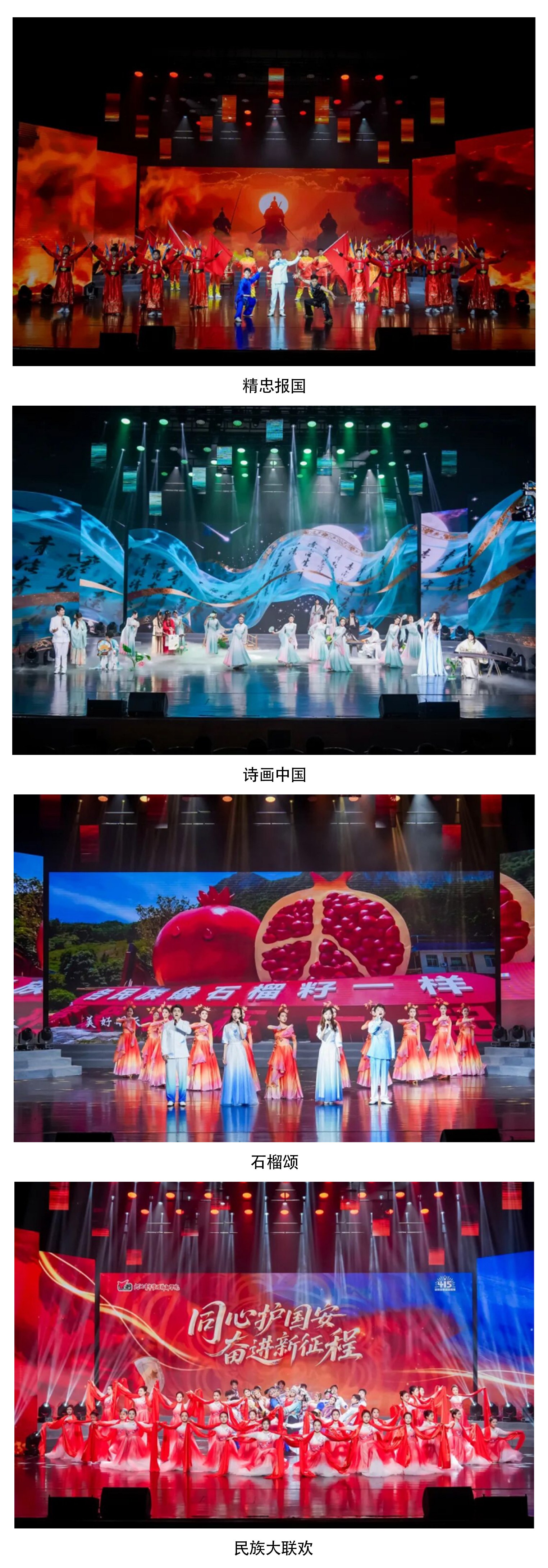 第二篇章,歌舞《精忠报国》以热血沸腾的表演展现家国情怀与铁血忠诚;音舞诗画《诗画中国》从文化自信的维度奏响国安礼赞;歌舞《石榴颂》与舞蹈《民族大联欢》生动展现了各民族如石榴籽般紧紧相依的团结深情。