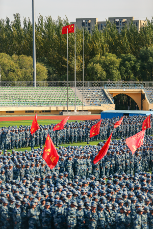 2025级新生身着整齐的军训服,队列严整,目光炯炯。国旗护卫队迈着铿锵有力的步伐,护送三面国旗缓缓入场,全场肃然起敬。微风轻拂,国旗舒展飘扬,仿佛在诉说着国旗背后动人心弦的故事。
