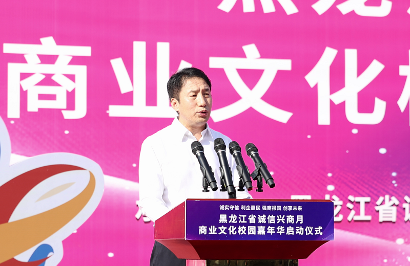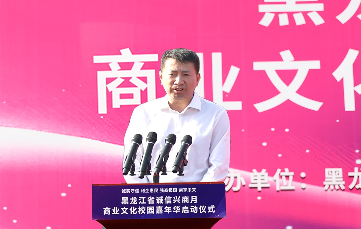 哈尔滨商业大学党委副书记、校长李景义致辞。李景义指出,在商业文化校园嘉年华活动现场,齐聚龙江“老字号”、龙江非遗项目、龙江文旅项目、龙江品牌公益项目、本土新势力企业等80余家龙江企业品牌代表,共同讲好龙江商业故事,传播龙江商业声音,为推动龙江高质量发展可持续振兴注入新动能。哈尔滨商业大学因商而起,缘商而兴。建校70余年来,学校始终立足商科办学特色,将诚信文化、诚信教育根植于学校育人理念,渗透到教书育人全过程,诚信广场、诚信文化研学馆、“诚信为商”故事雕塑、诚信主题命名道路等蕴含诚信元素的标志建筑和育人场馆成为以文化人、以文育人的校园标识,取得了良好的育人成效,培养出一批又一批诚信做人、诚信处事、诚信为商的优秀校友,得到了社会各界的广泛赞誉。学校将以举办此次活动为契机,承担好为党育人、为国育才的使命,肩负起社会服务和文化传承的职能,赓续文化血脉,深耕诚信建设,持续提升育人成效,在推进中国式现代化龙江实践中写好商大故事,展现商大担当,贡献商大力量。