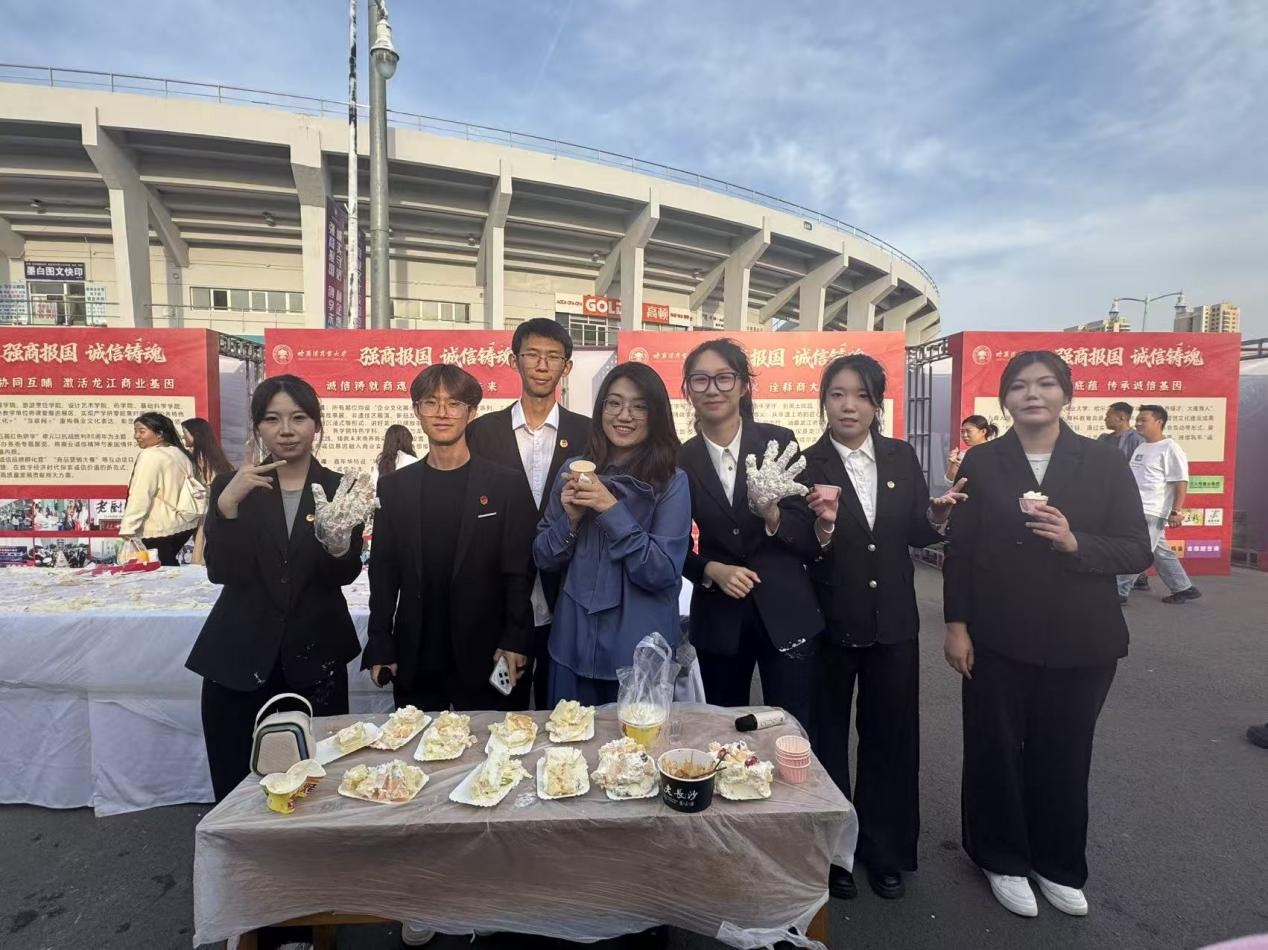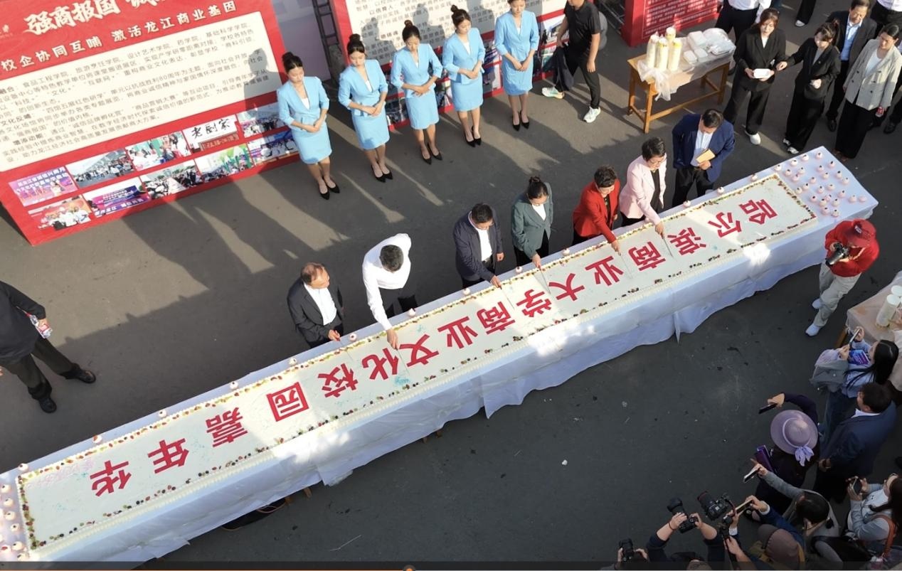 学校为本次商业文化校园嘉年华精心制作了一款长7.6米、宽74厘米的巨型蛋糕。7.6米的长度寓意着新中国成立76周年的辉煌征程,74厘米的宽度则象征着哈尔滨商业大学走过的74载春秋岁月。与会领导共同切分蛋糕,在场嘉宾和师生共同分享美味。