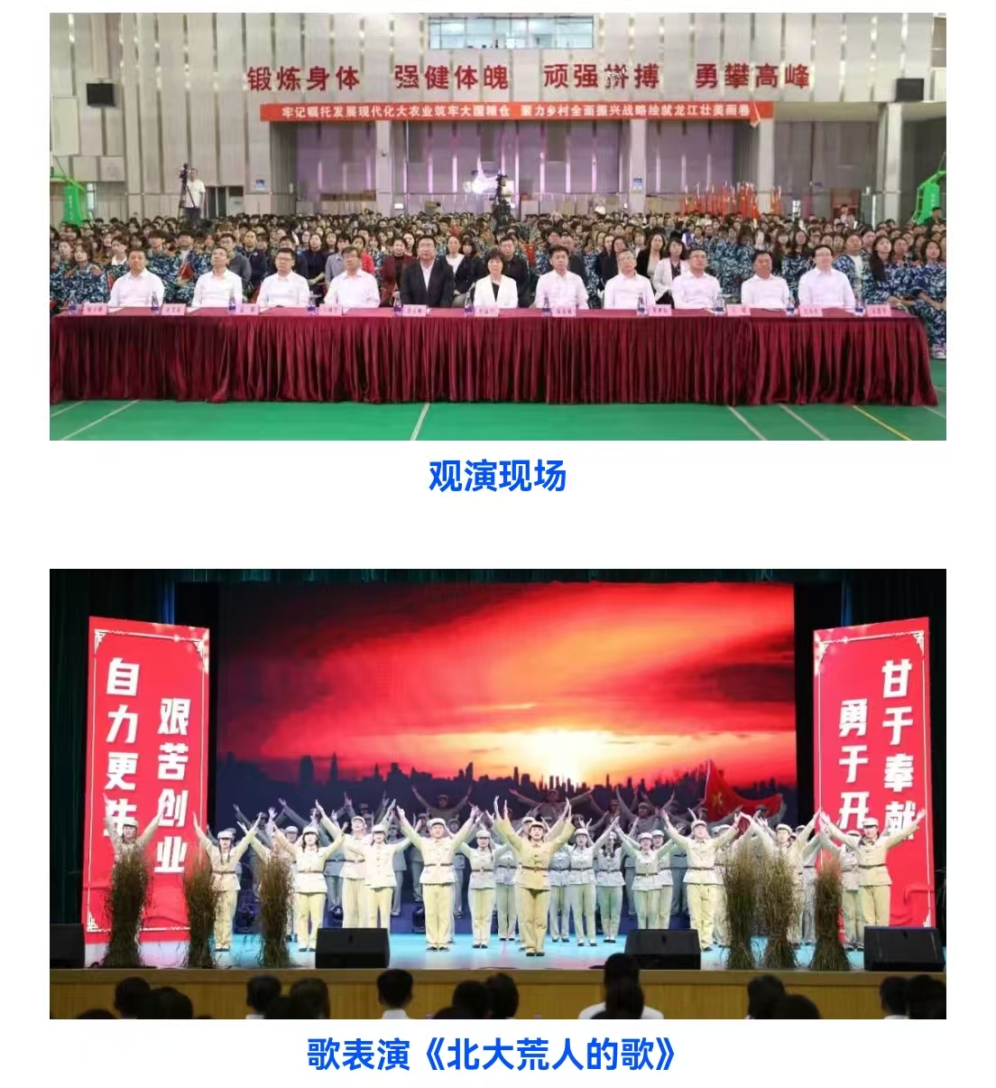 在第八个“中国农民丰收节”来临之际,为深入贯彻落实习近平总书记关于弘扬中国共产党人精神谱系的重要指示精神,传承“自力更生、艰苦创业、勇于开拓、甘于奉献”的北大荒精神,9月24日,黑龙江农垦职业学院在江北校区体育馆隆重举办“薪火相传 壮丽航程——传承和弘扬北大荒精神”专题文艺演出。北大荒集团领导、校领导及师生代表共计900余人观看演出。