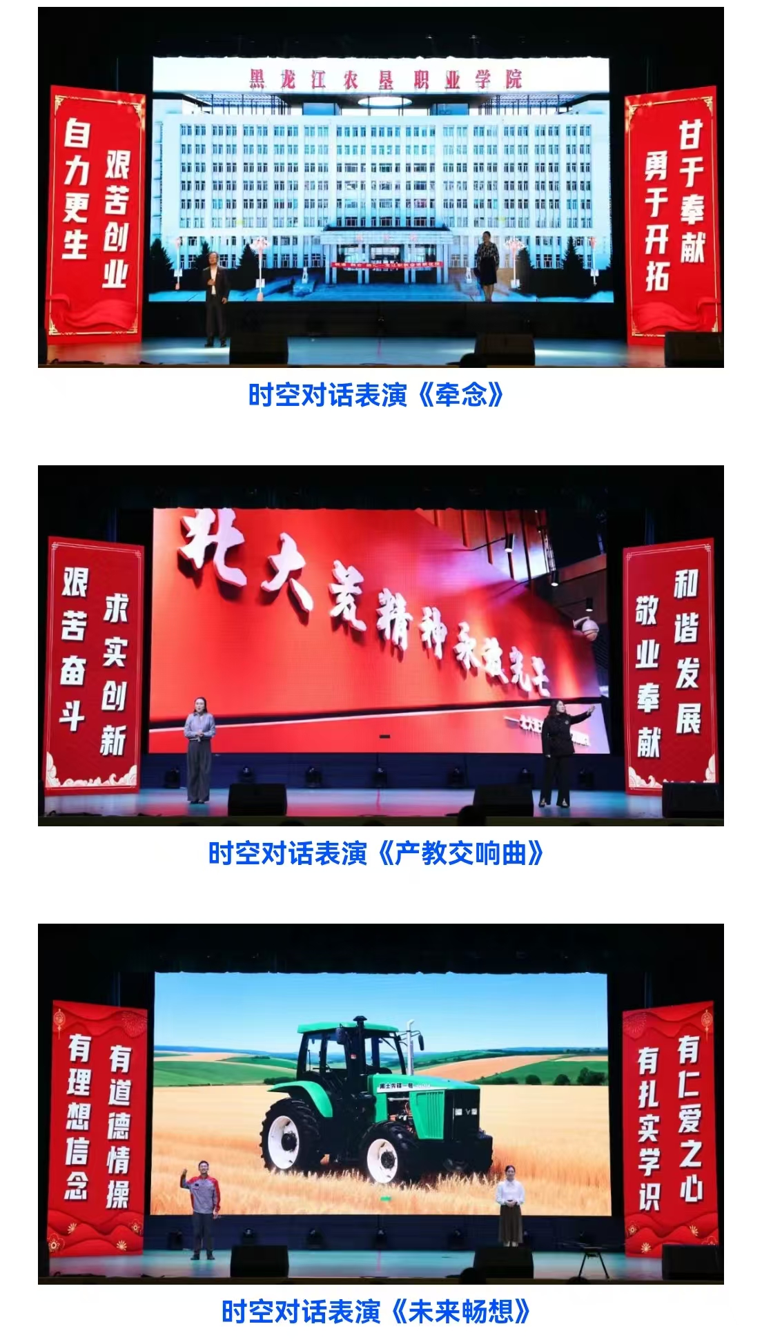 演出融合时空对话、情景表演、歌舞等多种艺术形式,生动展现北大荒精神的深刻内涵与时代价值。《牵念》《产教交响曲》《未来畅想》《当梦想插上翅膀》等节目,通过跨越时空的对话,凸显了农垦教育工作者扎根黑土、教书育人的奉献精神,以及产教融合、校企协同的育人成果。
