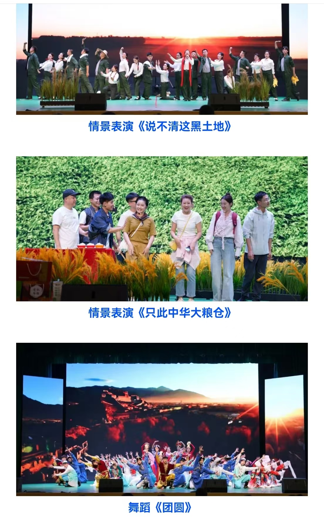 情景表演《说不清这黑土地》《只此中华大粮仓》展现了北大荒从艰苦的拓荒岁月到现代化大农业的巨变。舞蹈《团圆》《新天新地新时代》展现了当代北大荒人美好的幸福生活和昂扬的奋斗姿态。