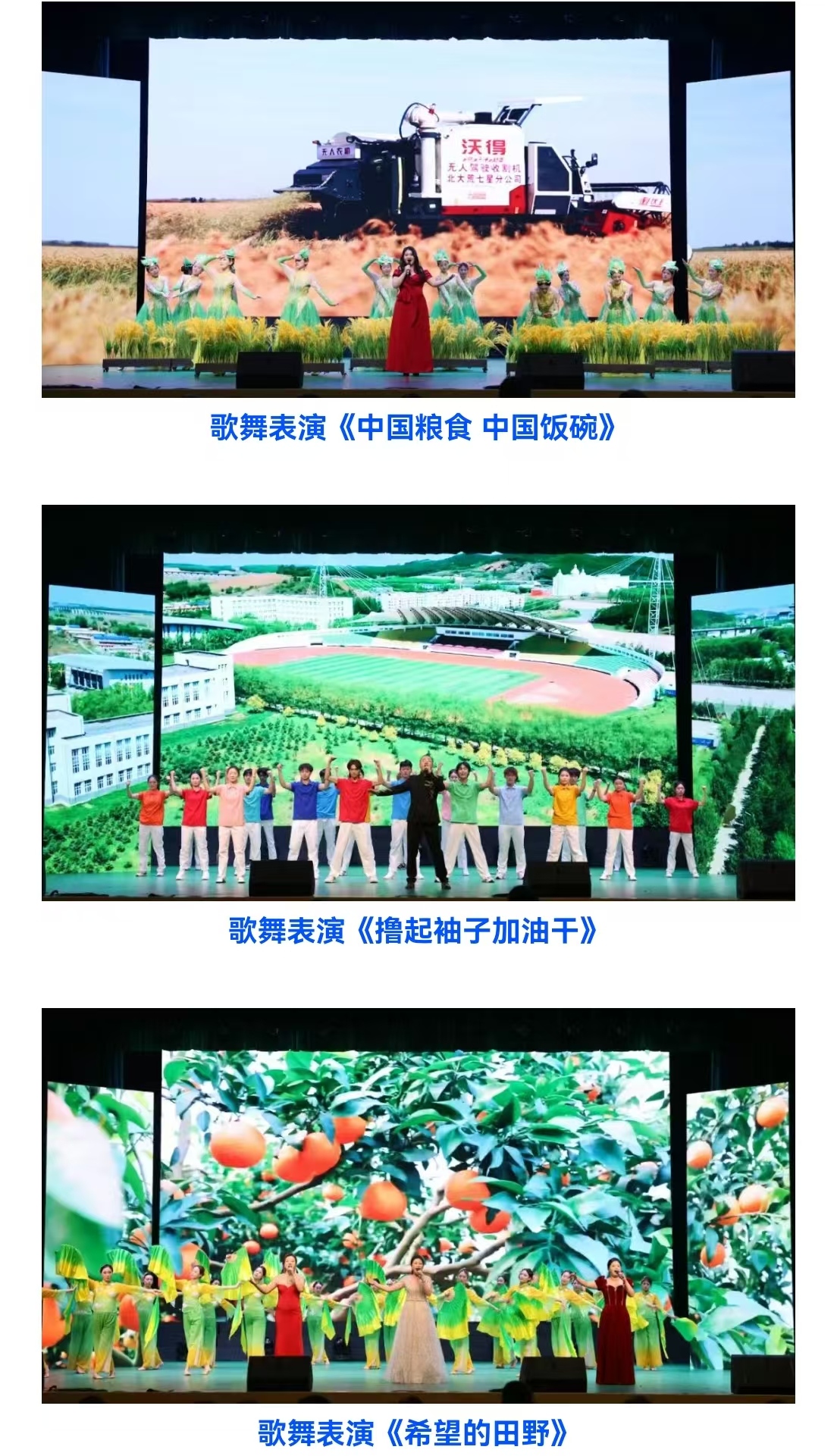 歌舞《中国粮食 中国饭碗》《希望的田野》《撸起袖子加油干》《我们的中国梦》则抒发了新时代农垦人强农兴农、服务国家粮食安全战略的坚定信念。