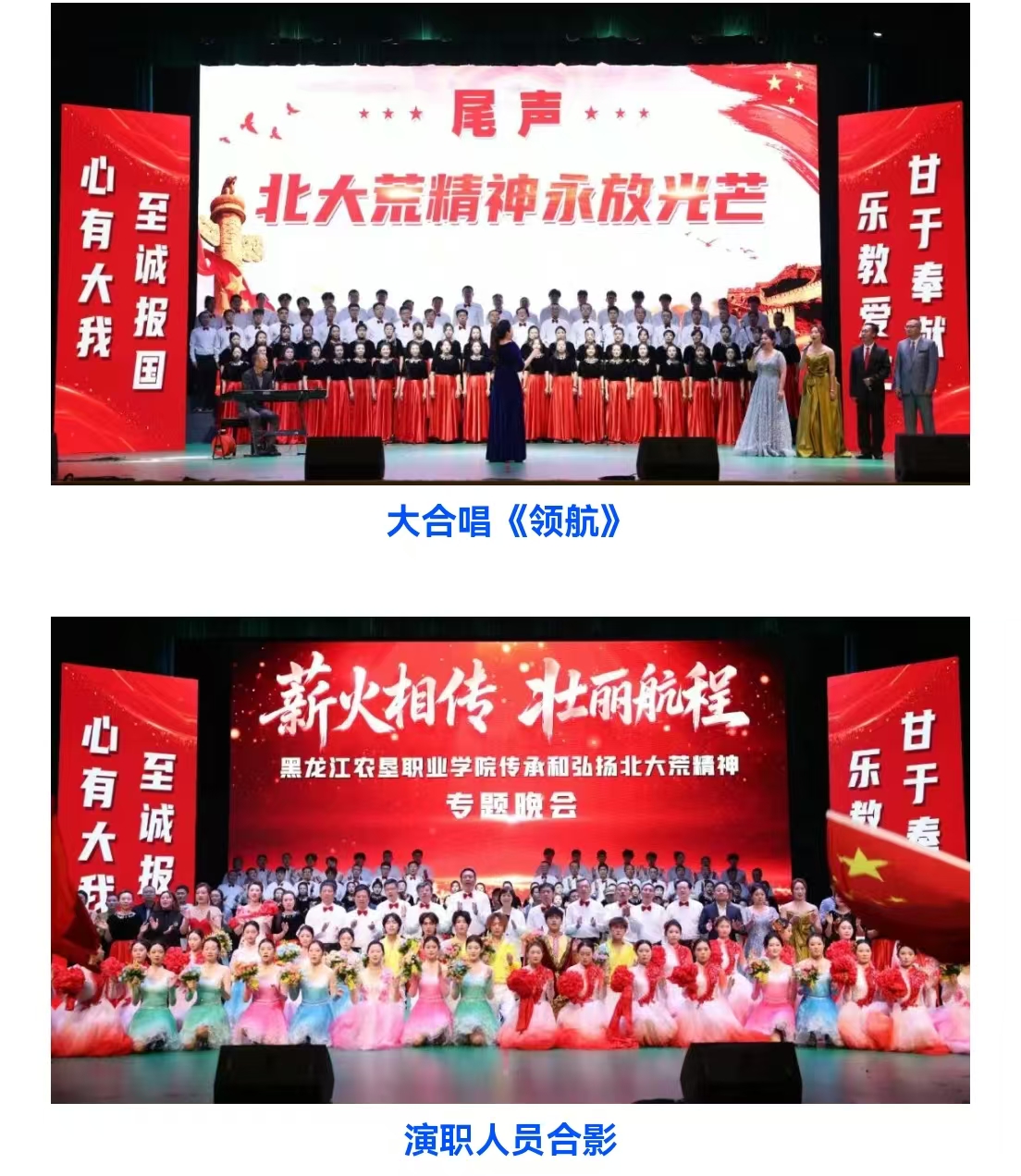演出在全体校领导、师生代表共同合唱《领航》的激昂歌声中圆满落幕,展现了农垦职院人传承红色基因、紧跟领航者、奋进新征程的坚定决心。