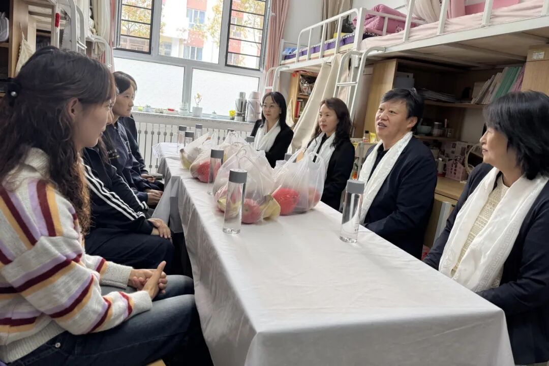 学校党委副书记、工会主席弓箭在基础医学院党委副书记刘颖,辅导员唐懿鸣、万雷陪同下走进学校“一站式”学生社区5公寓,与来自藏族、维吾尔族、朝鲜族等多个民族的学生代表亲切交流,还为同学们送上精心准备的学习文具,并将“眉纤额下现新月,青春永驻;气吐胸中贯长虹,豪气云天。”这两句词送给在场的同学们,希望同学们胸怀广阔、志在四方。