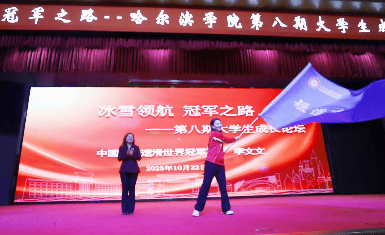 随后,校党委副书记李娜为哈尔滨学院短道速滑社团授旗,将活动的气氛推向了高潮。