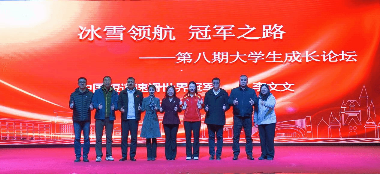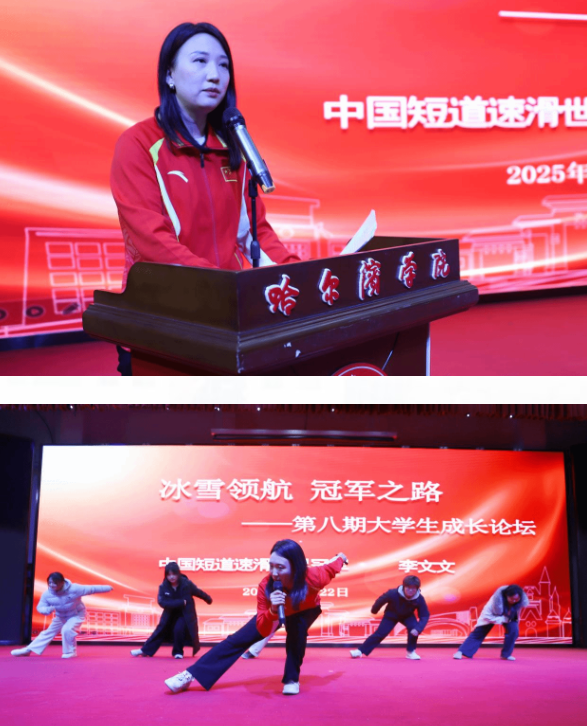 论坛特邀中国短道速滑世界冠军、哈尔滨学院体育学院冰雪运动专业教师李文文担任主讲嘉宾。她从自幼克服困难兼顾学业与训练,到60多次站上国内外冠军领奖台的成功与荣耀;从比赛对抗时的坚持与拼搏,到为国争光时的激动与喜悦,倾情为大家讲述成长经历和比赛感悟,激励广大同学以“冰”砺志,为校争光。同时,李文文以现场互动的方式,为与会师生讲授了短道速滑运动知识,点燃了大家对冰雪运动的热情。