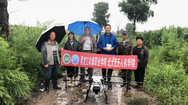 技术服务——拓宽产业链。“只要天气好,我们可以一直喷!”2019 年阿城丰收乡玉米黏虫灾害现场,来自黑龙江农垦职业学院两位无人机教员的这句话,让种植户吃下了一颗定心丸。接到当地求助后,李石、高文昊带上专业飞防设备连夜驰援,在丘陵地带信号遮挡、高温曝晒的不利条件下,每天凌晨4:00点便站在水箱和铲车上高空作业, 5 天完成 2562 亩农田灭虫任务,有效减少了当地农民的损失。