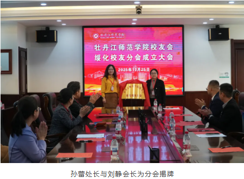 牡丹江师范学院招生就业处处长孙蕾与绥化校友分会会长刘静为绥化校友分会揭牌。