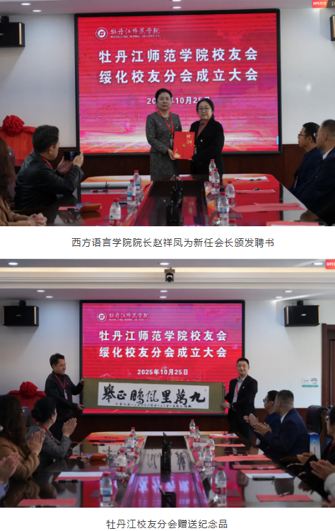 牡丹江师范学院西方语言学院院长、二级教授赵祥凤为绥化校友分会新任会长刘静颁发聘书;牡丹江校友分会秘书长陶可贤代表牡丹江校友分会赠送纪念品。