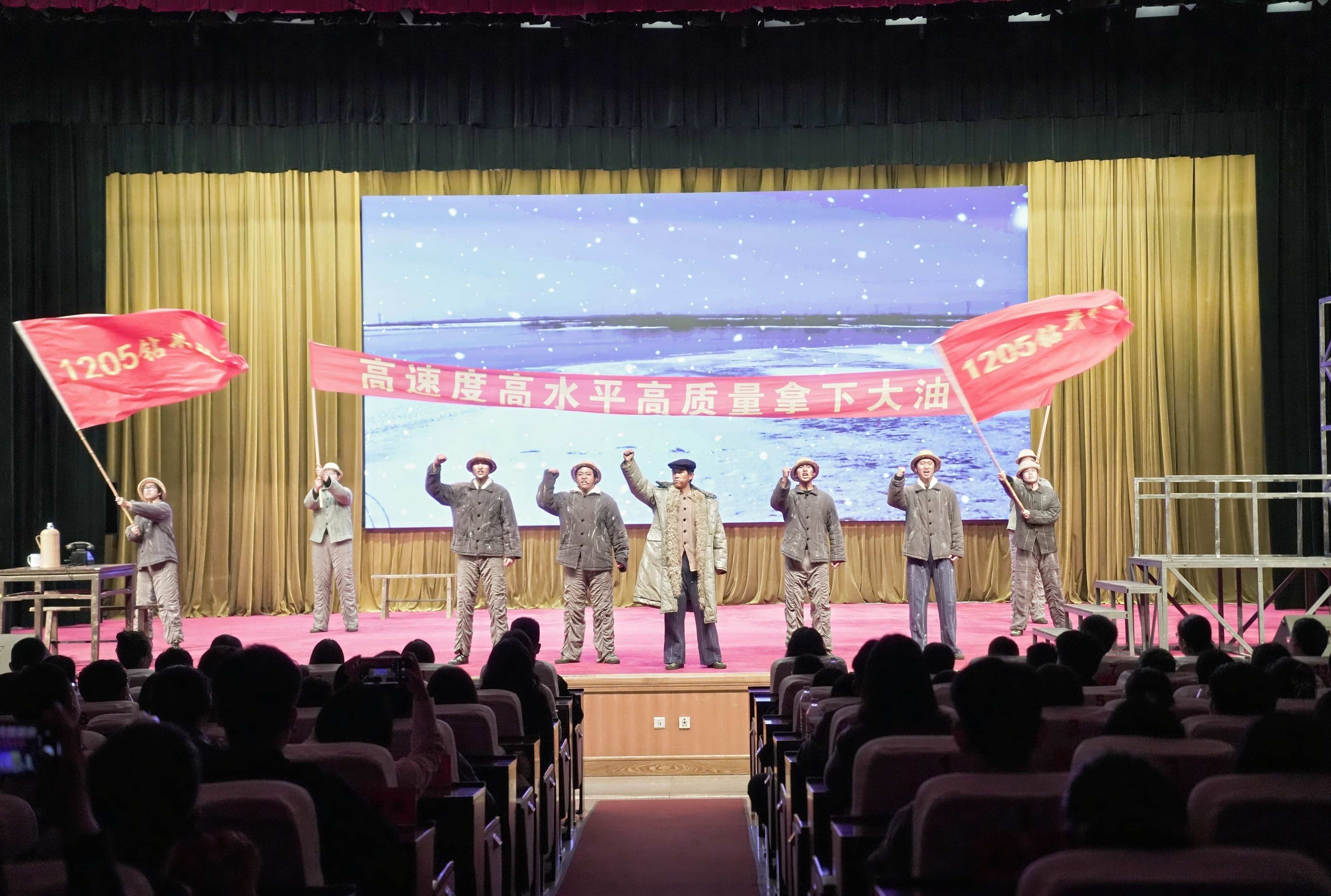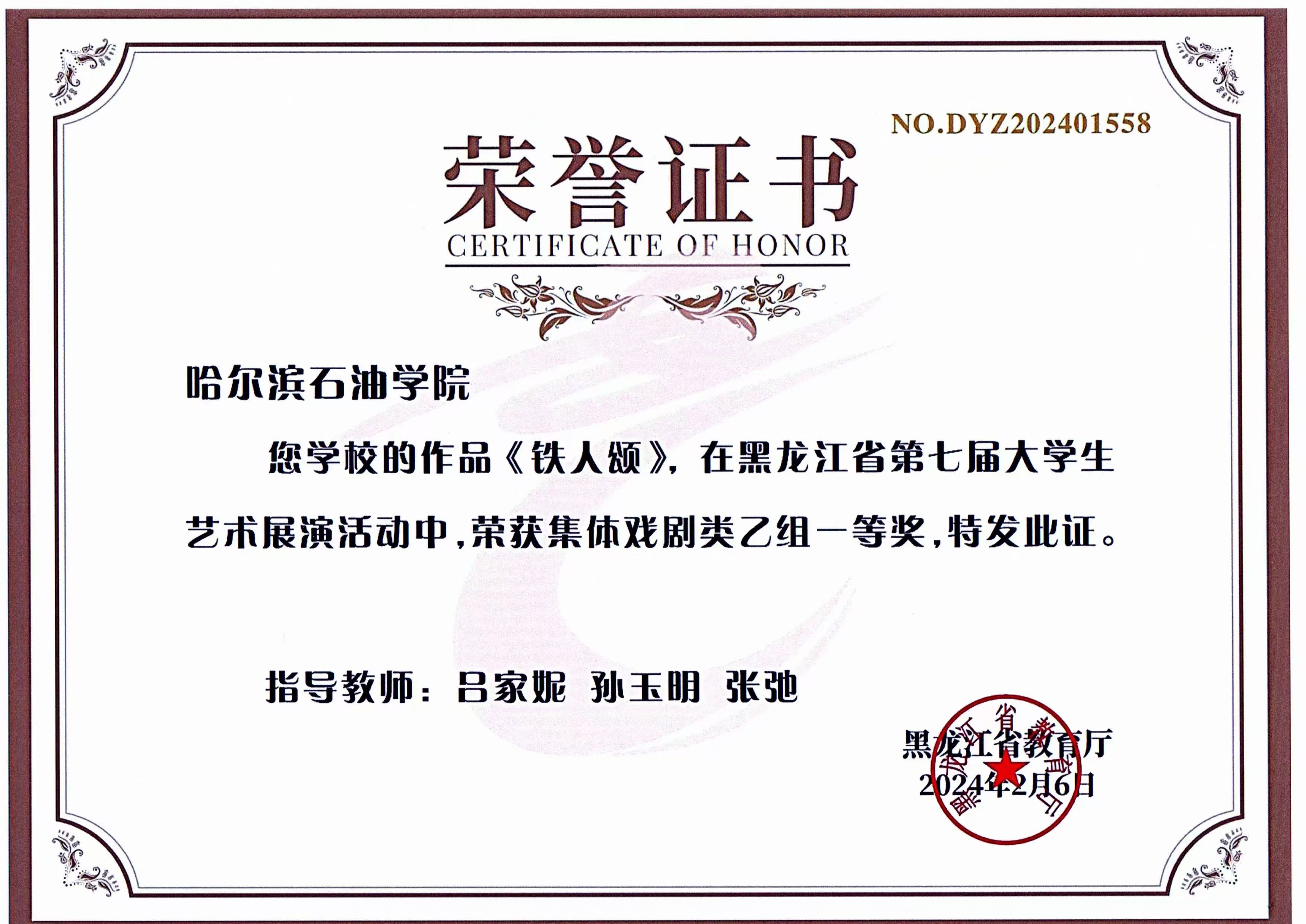 作为学校“铁人精神素养提升教育工程”的核心载体,《铁人颂》构建了“创、演、学、践”一体化的文化育人体系。参演学生从角色塑造到情感体验,实现了价值观的深度内化——话剧团学生演员中多名毕业后选择奔赴石油一线。剧中王进喜扮演者、石油化工学院2024级学生李彬动情道:“当我穿上工装站上舞台,仿佛与铁人灵魂共鸣,他的精神已融入我的血脉,照亮我的精神世界!”该剧先后斩获黑龙江省大学生艺术展演戏剧一等奖、全国石油高校文化作品微电影一等奖,铁人大学生话剧团更获评首批省级优秀艺术团,彰显了“以文化人、以美育人”的显著成效。