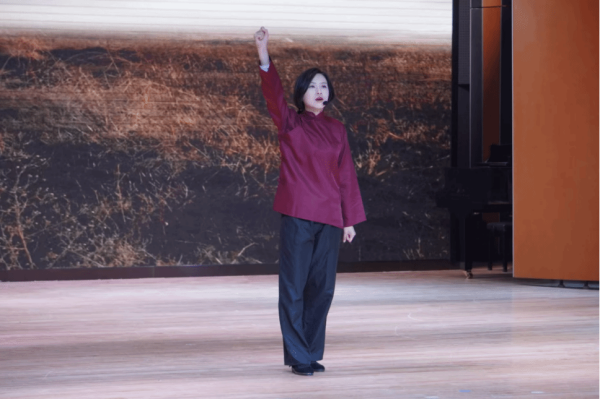 演出尾声,全体演员齐声朗诵《滨江抒怀》,“未惜头颅新故国,甘将热血沃中华”的铿锵诗句回荡在音乐厅内,直抵人心。随后,悠扬的《如愿》旋律响起,演员与现场观众轻声合唱,歌声中满是对革命先烈的缅怀与对盛世中国的礼赞,将现场气氛推向高潮。