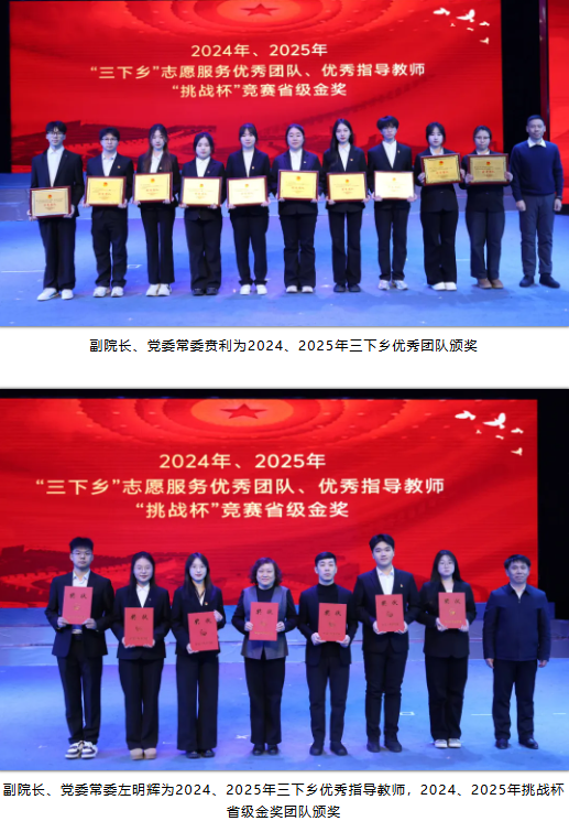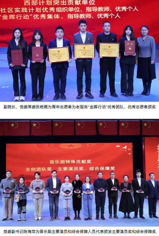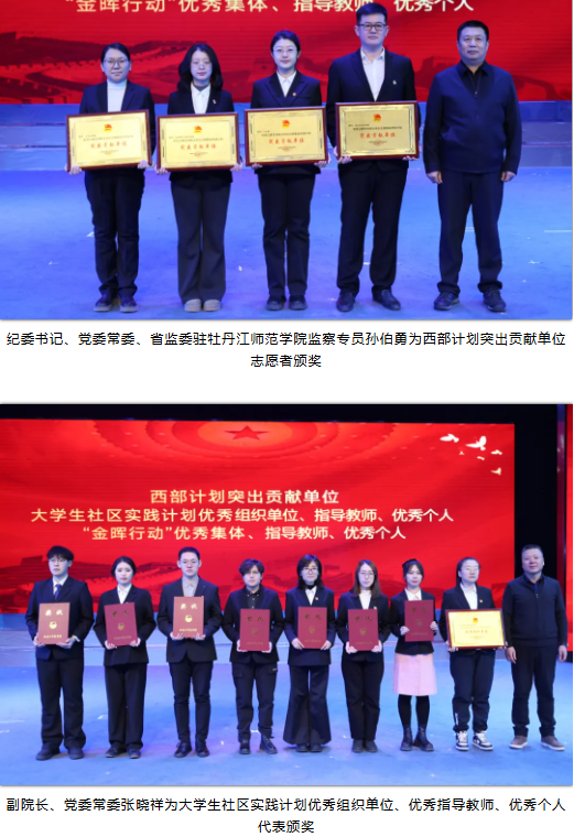 此外,在活动中间环节,学校领导为获得三下乡优秀团队,三下乡优秀志愿者、三下乡优秀教师代表、挑战杯比赛获奖选手代表、西部计划贡献单位、“金晖行动”以及大学生社区实践计划优秀组织单位、优秀指导教师、优秀个人代表颁发证书和奖牌、为音乐与舞蹈学院颁发最佳贡献奖、为东北抗联原创音乐剧《不可磨灭的信念》主创团队、主要演员、综合保障等团队代表颁发纪念奖。