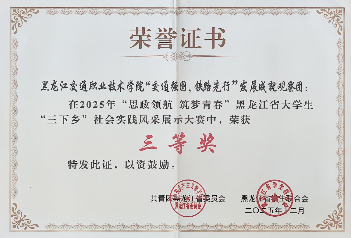 近日,由共青团黑龙江省委员会、黑龙江省学生联合会主办的2025年“思政领航·筑梦青春”全省大学生“三下乡”社会实践风采展示活动在黑龙江大学举办。黑龙江交通职业技术学院“交通强国,铁路先行”发展成就观察团从全省69所高校组建的8000余支队伍中脱颖而出,荣获三等奖。