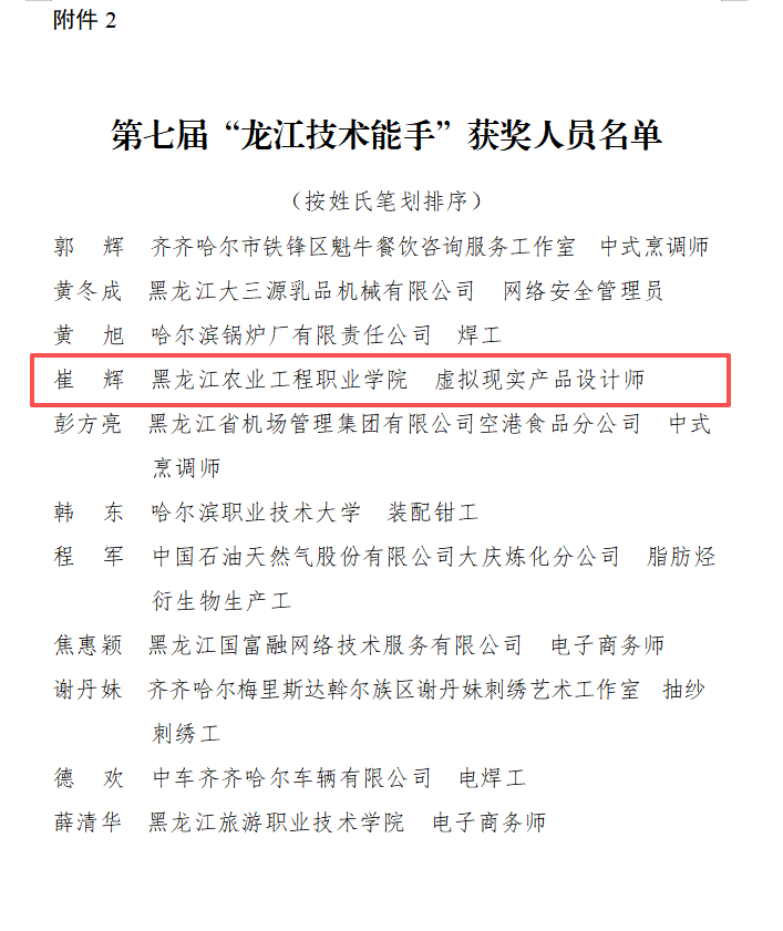 近日,黑龙江省人民政府发布了关于表彰第七届“龙江大工匠”和“龙江技术能手”获奖人员的决定,黑龙江农业工程职业学院信息工程学院数字媒体技术专业带头人崔辉凭借在虚拟现实技术行业领域的长期深耕探索,以及不断打磨锤炼出的精湛技艺,于全省众多优秀技能人才中脱颖而出,荣获“龙江技术能手”荣誉称号。