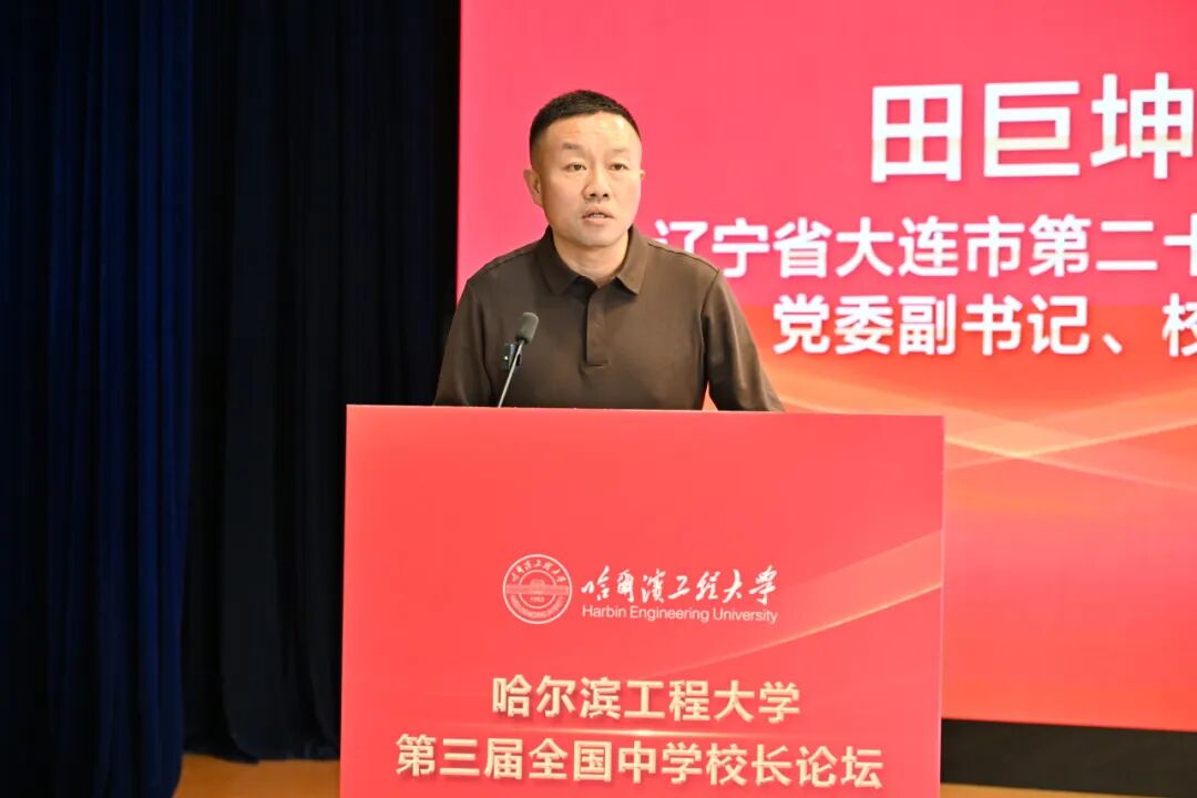 辽宁省大连市第二十四中学党委副书记、校长田巨坤作题为《厚植沃土 助力脱颖 以高质量课程建设和实施探索大中衔接育人模式》主旨报告,从构建“一体·两翼·三层·四类”多元适配课程体系、建设“SQIP四动”高质课堂、实施“一元二维三层四力”培养路径等三个方面分享拔尖创新人才培养的特色做法。他希望未来能与哈工程共同培育生活有品质、生命有价值,对家庭有担当、社会有贡献,对国家忠诚、世界关心的拔尖创新人才。