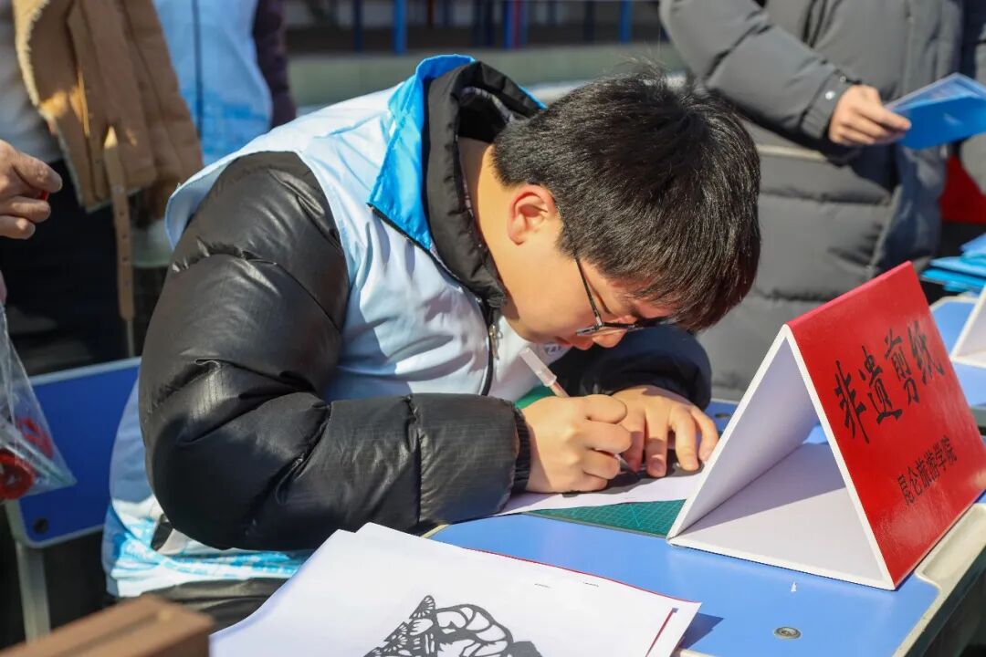 “手腕稳住,下刀要干脆。”艺术系的志愿者指导一位群众。群众手中的红纸上,一个戴着军帽的轮廓已经成型。