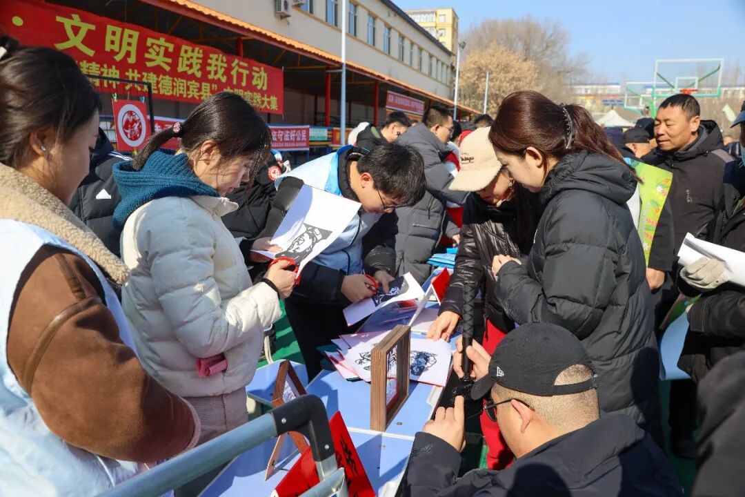 这场“文明实践大集”由宾县新时代文明实践中心主办,联合多家单位共同开展。从健康义诊到法律咨询,从政策宣讲到现场招聘,几十个服务摊位在广场上依次排开。而在非遗剪纸教学区,学校的师生们成了“主角”。