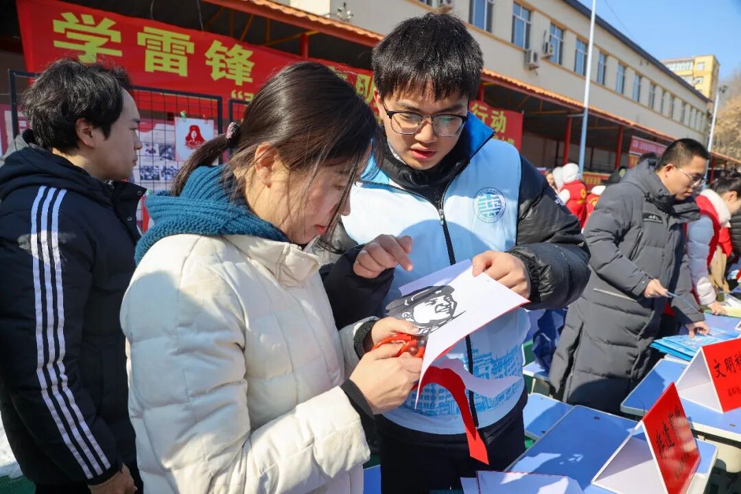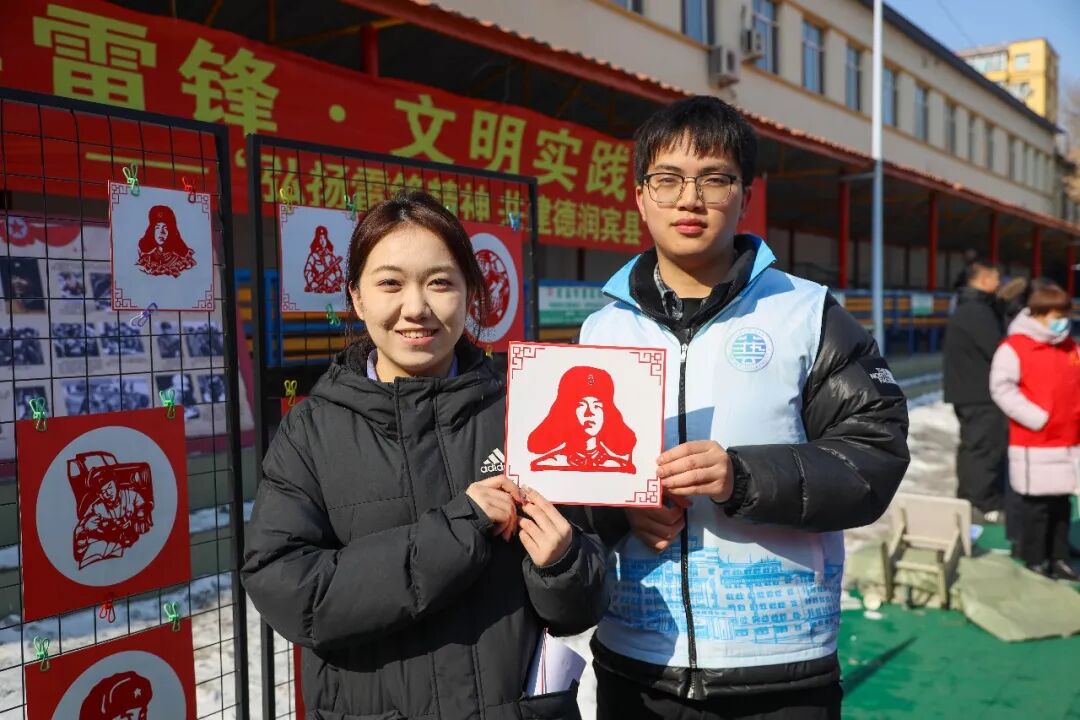 3月5日,第63个学雷锋纪念日,宾县休闲广场上人流涌动。在“学雷锋·文明实践大集”的一角,几张长桌被围得满满当当,学校的10余名师生们正带着市民体验非遗剪纸。红纸在指尖翻转,剪刀游走间,雷锋同志的肖像逐渐清晰。