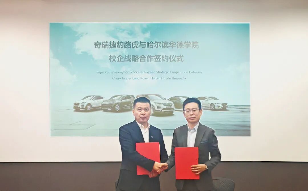 △ 校长李长威与奇瑞捷豹路虎汽车有限公司党委副书记、工会主席、人力资源与行政部执行副总裁李峰签订校企合作协议