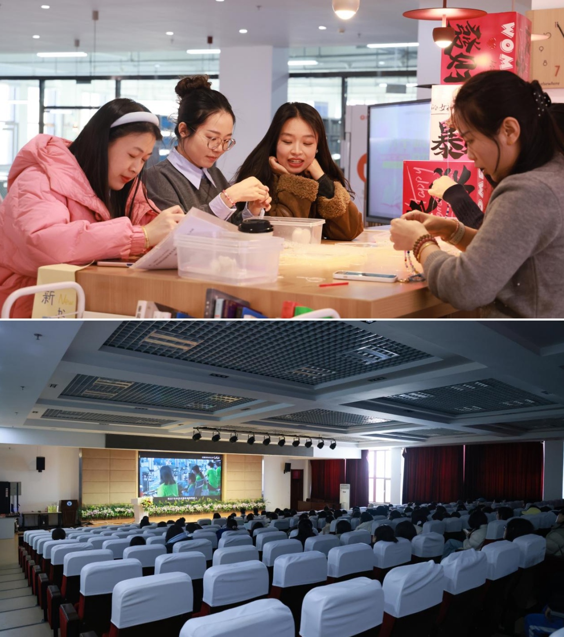 3月6日下午,活动聚焦女教职工内在成长。学校党委书记袁伟来到现场,与老师们亲切交流,为大家送上节日的问候与祝福。“向阳·她心声”健康讲座围绕女性常见问题与心理调适开讲,引导大家提升健康意识。短片《光影里面的巾帼力量》,展现了不同行业女性的坚守与绽放,激发了在场教师的职业自豪感。在“女性悦享空间”,书展精选女性成长类书籍,老师们在书香中汲取“她力量”,并参与抽奖活动,收获实用礼品。手工DIY区的串珠与剪纸活动同样热闹非凡,大家在创作中感受艺术之美,留下独特的节日记忆。