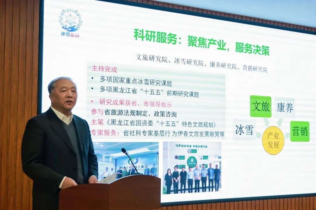 黑龙江区域文旅产业研究院院长、黑龙江工程学院昆仑旅游学院崔玉范教授作《深化产教融合赋能龙江文旅高质量发展》分享,结合龙江冰雪文旅发展亮眼成绩单,从人才链与产业链咬合、创新链与资源禀赋赋能、产教融合共同体协同发力三个维度,阐述了产教融合落地实践路径。