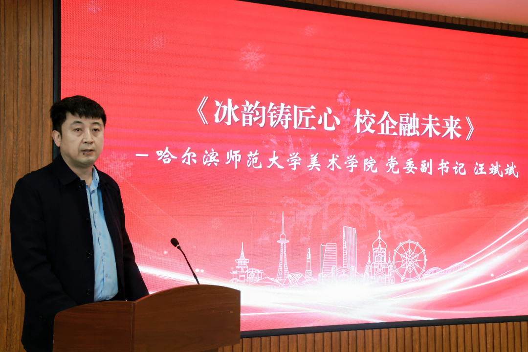 哈尔滨师范大学美术学院党委副书记汪斌斌以《冰韵铸匠心校企融未来》为题,分享了高校依托学科优势,在冰雪文旅人才培养、产业服务、文化传播方面的特色实践,展现了校企协同育人的丰硕成果。