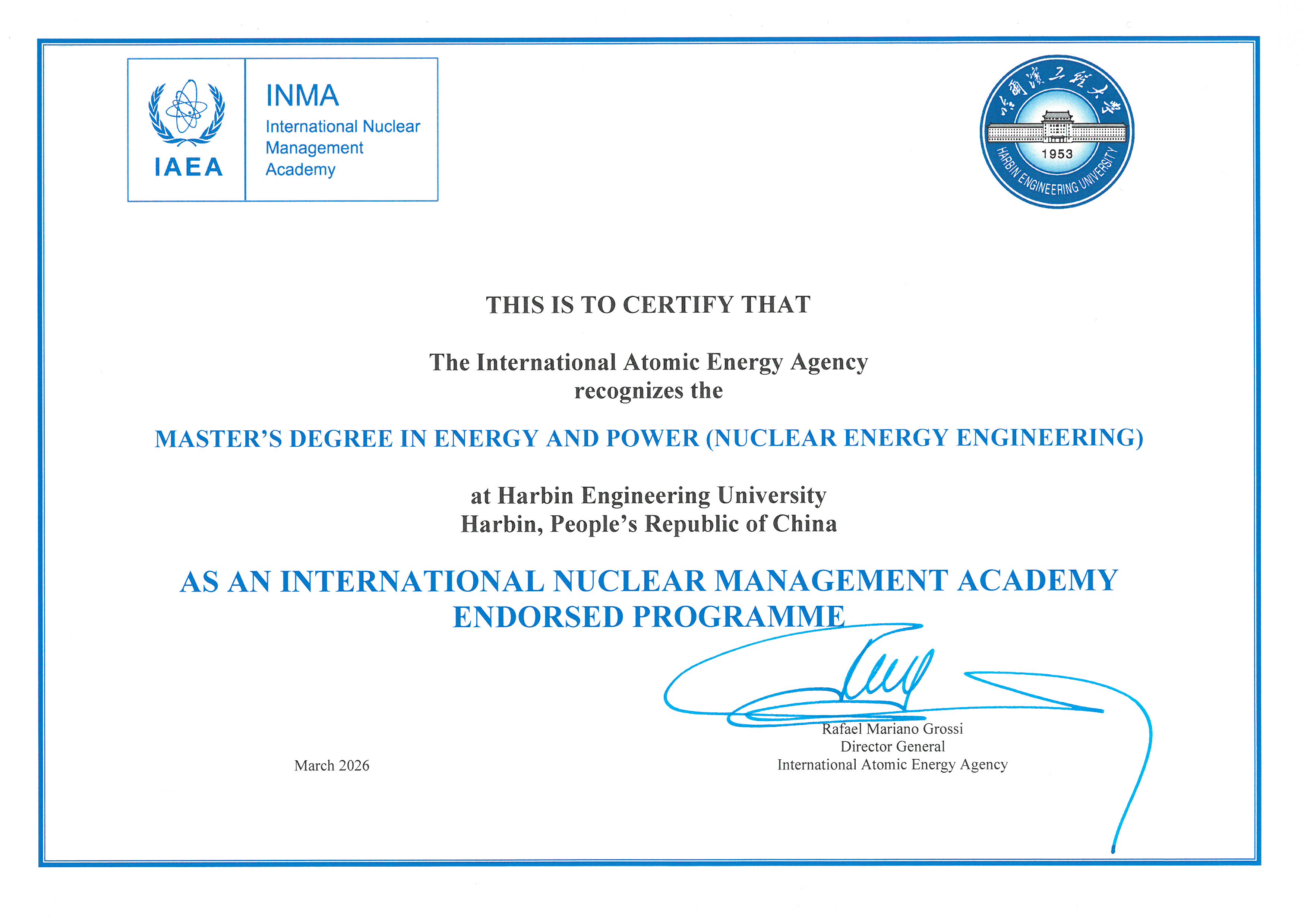 “哈工程将立足核领域人才培养优势,以国际化育人平台培养兼具核科学技术、国际视野与管理能力的复合型人才。”哈尔滨工程大学校党委副书记、校长殷敬伟表示。3月25日,国际原子能机构总干事拉斐尔·马里亚诺·格罗西访华,在中国国家原子能机构单忠德主任的见证下,向哈尔滨工程大学颁发国际核管理学院核技术管理硕士教育认证证书,殷敬伟代表学校接受证书。哈工程作为国内首个获得国际原子能机构国际核管理学院核技术管理硕士教育认证的高校,实现了我国在该项目国际认证零的突破。