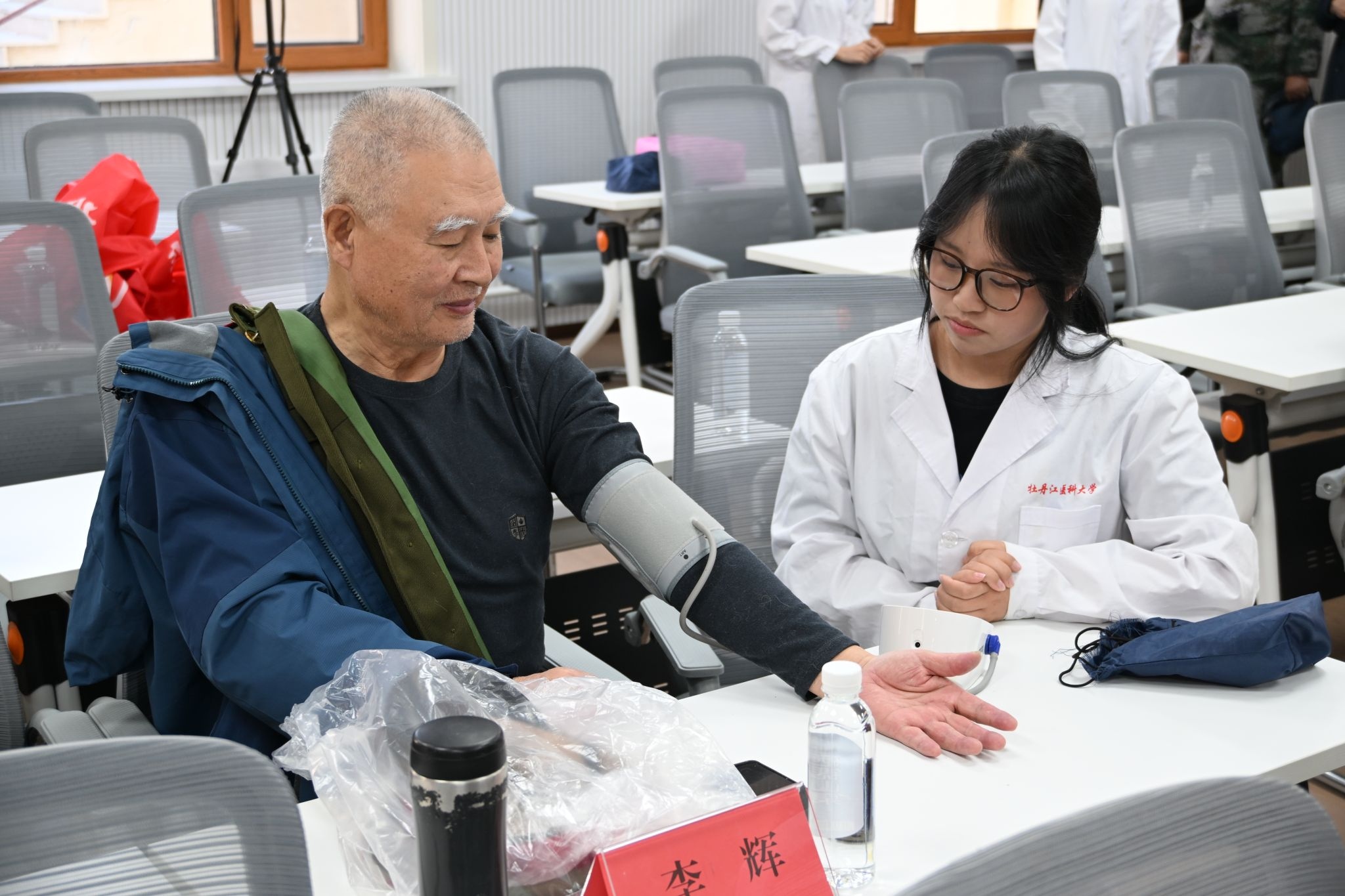现场服务环节,学生志愿者们为军休干部提供一对一的血压测量服务,认真填写健康登记表,结合检测结果给出个性化健康建议,并发放医疗常识宣传手册和健康小礼品,用专业的服务守护军休干部的健康。