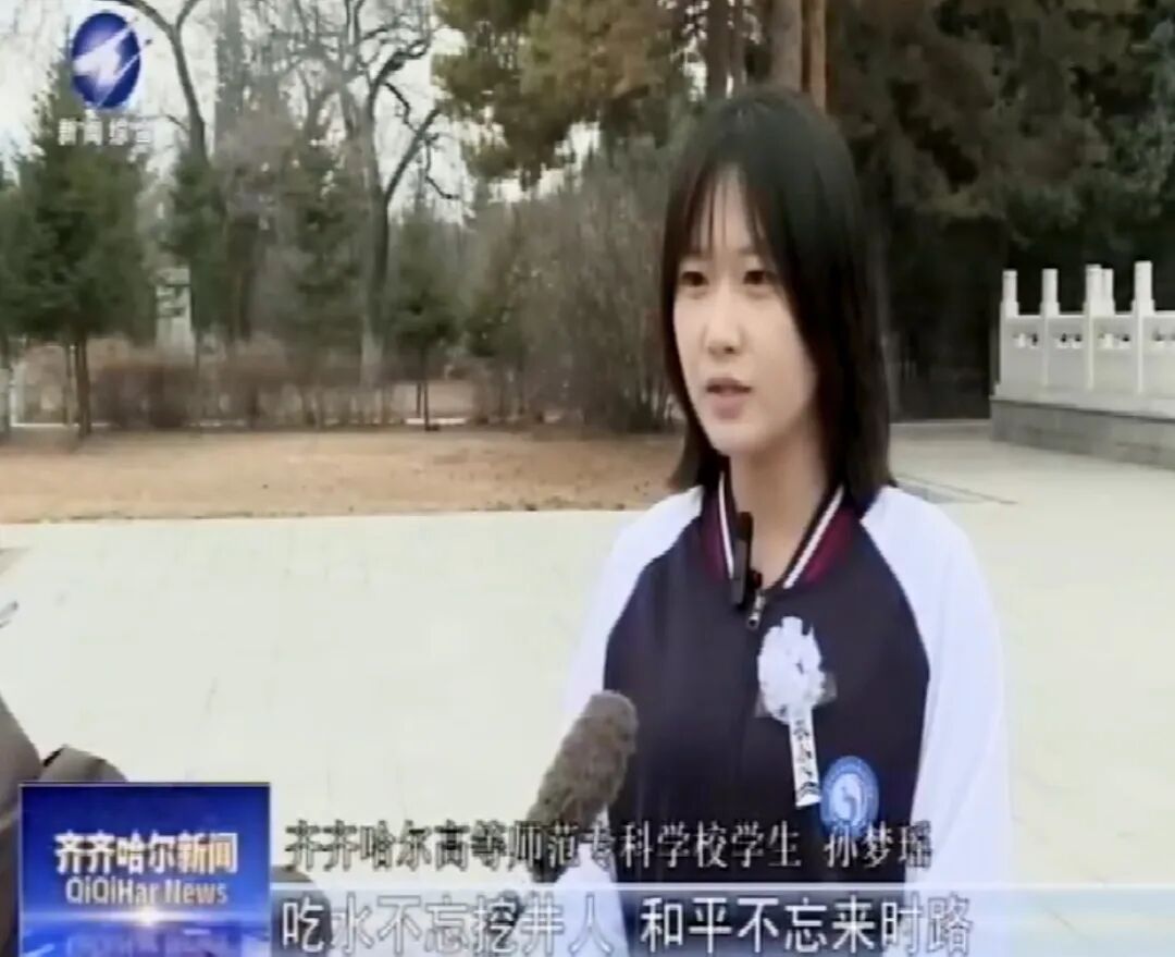 上午9时,西满英烈纪念碑前响起雄壮的国歌声,奏唱国歌后,同学们向为解放齐齐哈尔、为中国人民解放事业英勇献身的烈士们默哀。少先队员代表齐唱《我们是共产主义接班人》,表达了当好社会主义建设者和接班人的决心和信心。青年代表为英烈敬献花篮并献词,要将对先烈的崇敬之情,转化为勤奋学习、报效祖国的实际行动。来自齐齐哈尔高等师范专科学校职业技术系的孙梦瑶同学接受电视台采访,她说:“作为大学生,我们必将勤学苦练,接过先辈旗帜,努力奋斗,建设家园。”