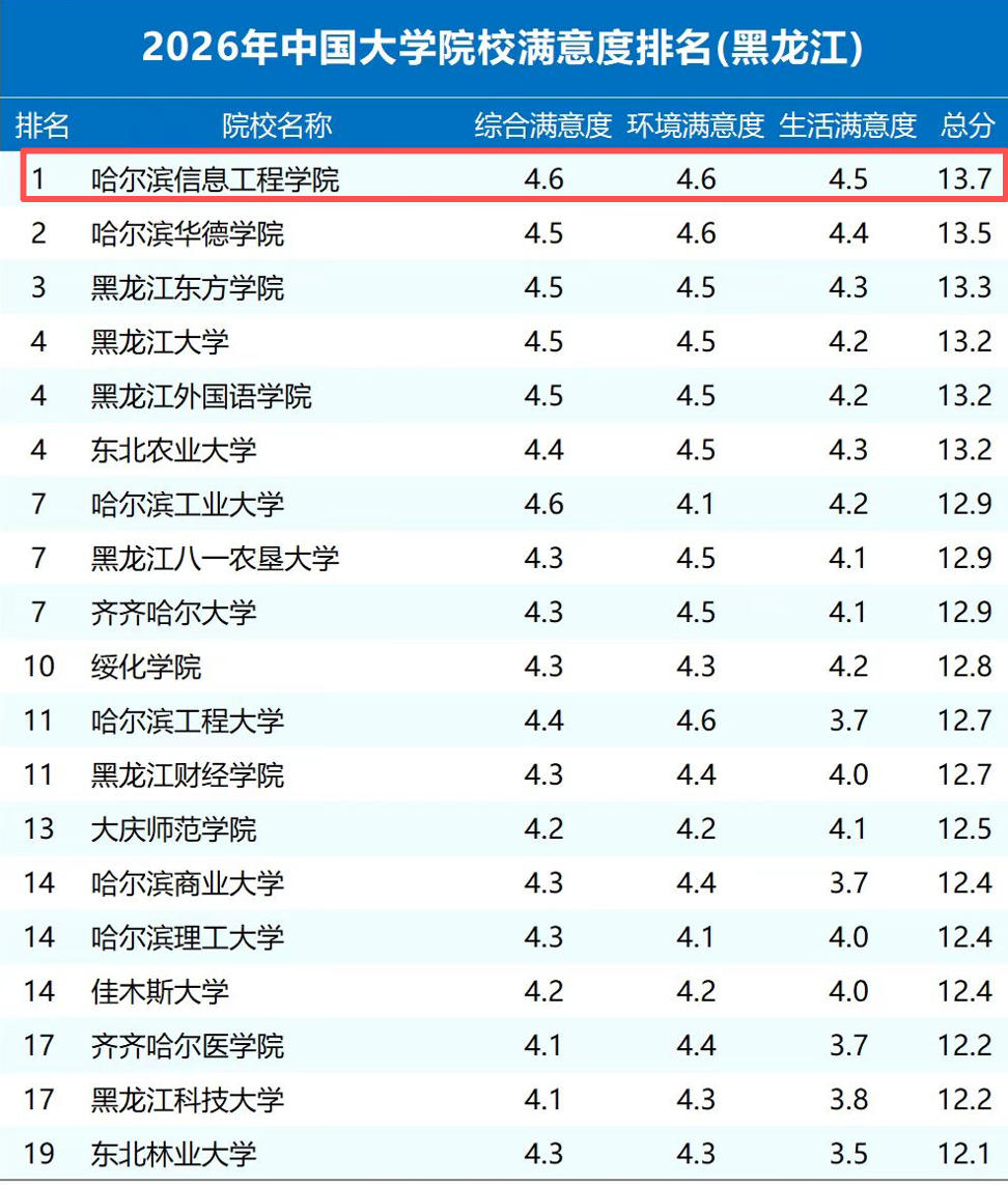 数据显示:哈尔滨信息工程学院以综合满意度4.6、环境满意度4.6、生活满意度4.5,总分13.7的优异成绩,位列: