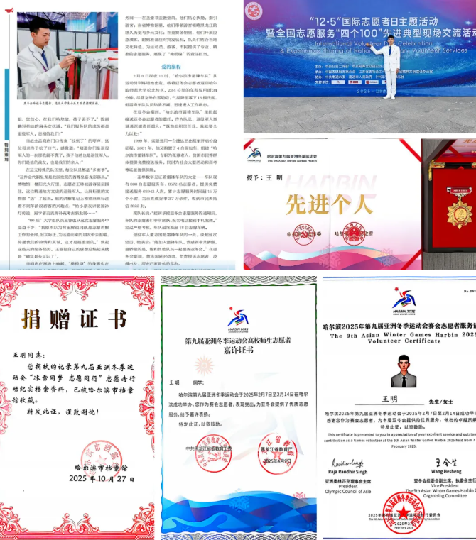 他的事迹被央视报道,并被《中国退役军人》杂志专题刊登,其服务纪实档案也被哈尔滨市档案馆收录。他还受邀参加全国志愿服务交流活动、亚冬会总结表彰大会,荣获亚冬会高校志愿者师生嘉许、哈尔滨市先进个人等多项荣誉,成为校园中当之无愧的“青春榜样”。