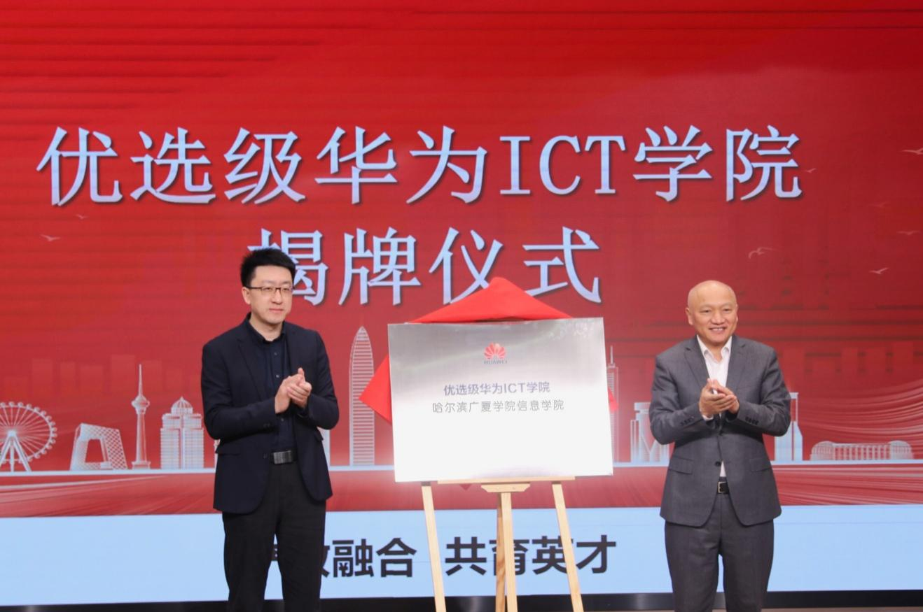 在全场嘉宾和师生的见证下,李忠祥书记与陆遥副总经理共同为“哈尔滨广厦学院优选级华为ICT学院”揭牌!红绸揭开,标志着双方合作进入新的发展阶段,也象征着校企协同育人平台正式落地。