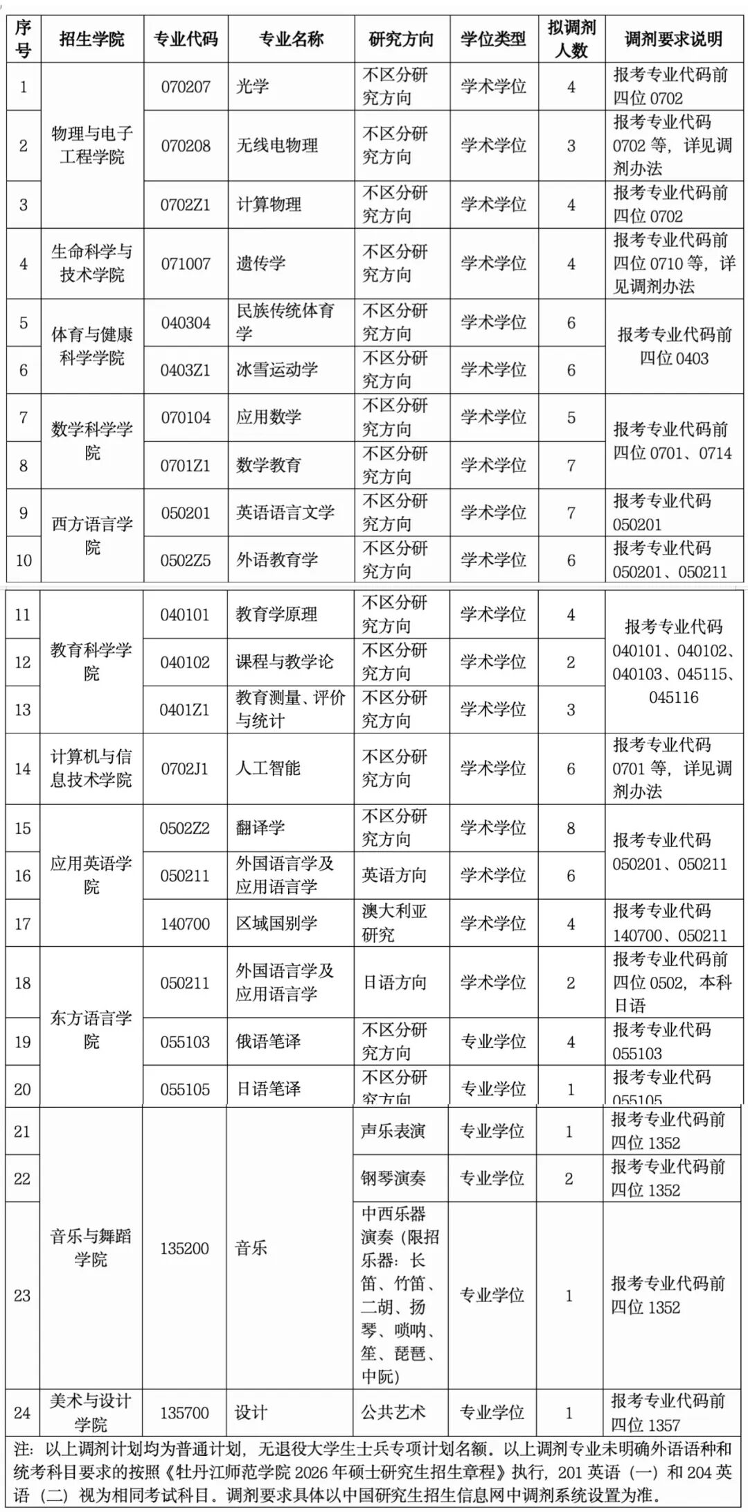 (五)如计划调整或经调剂复试后仍有计划缺额,学校将再次通过调剂系统发布调剂需求,考生(含被牡丹江师范学院解锁考生)可继续选择调剂。