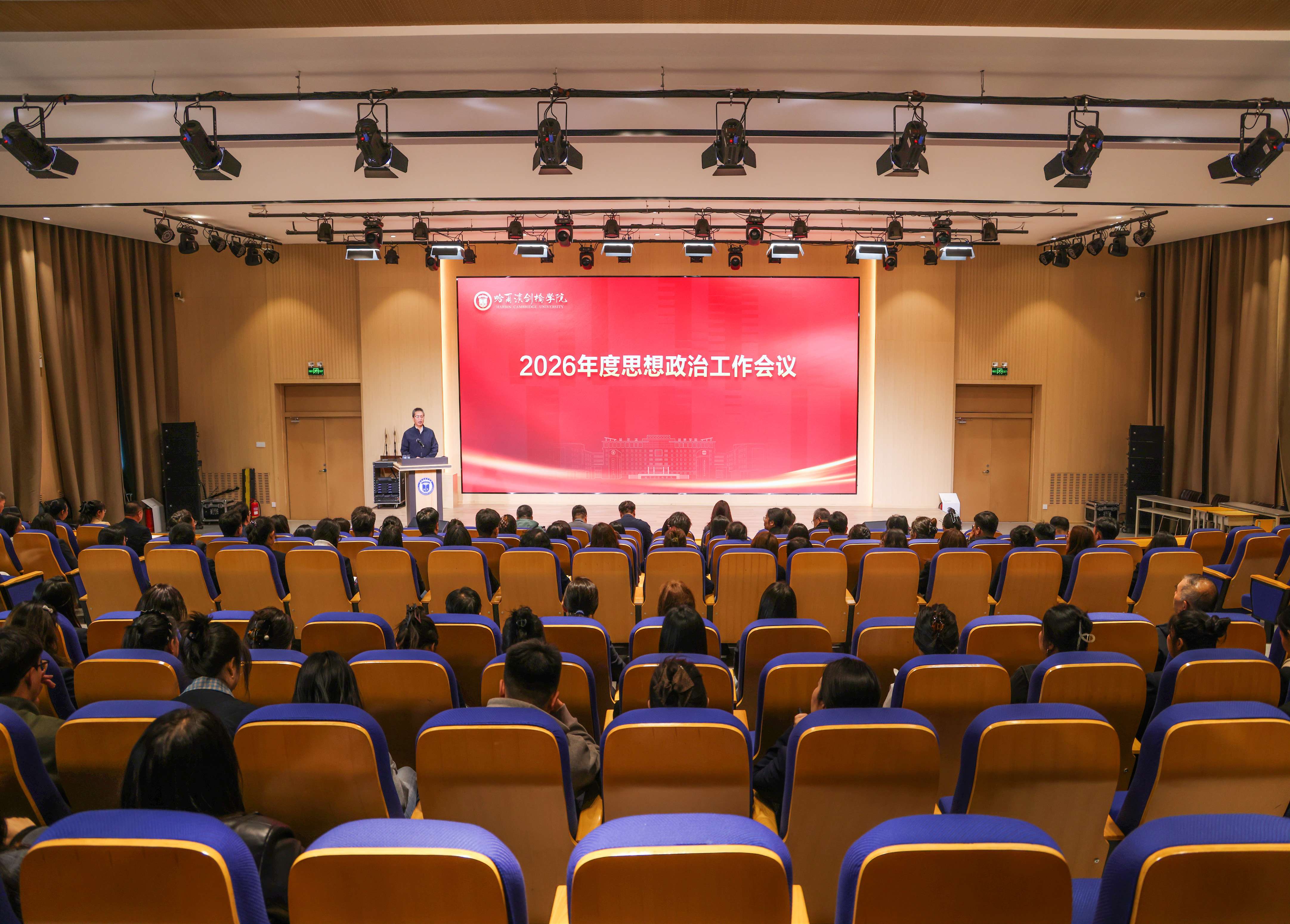 为贯彻落实《中国共产党思想政治工作条例》,高质量推进新时代立德树人工程,系统总结学校思政工作成效、部署下一阶段重点任务,4月9日下午,哈尔滨剑桥学院2026年度思想政治工作会议在正德楼一楼多功能厅召开。学校党委书记袁伟主持会议并讲话,校领导班子、党建和思政研究中心成员、相关职能部门负责人、各二级党组织书记、学工人员、思政课教师、思政精品项目联络员参会。