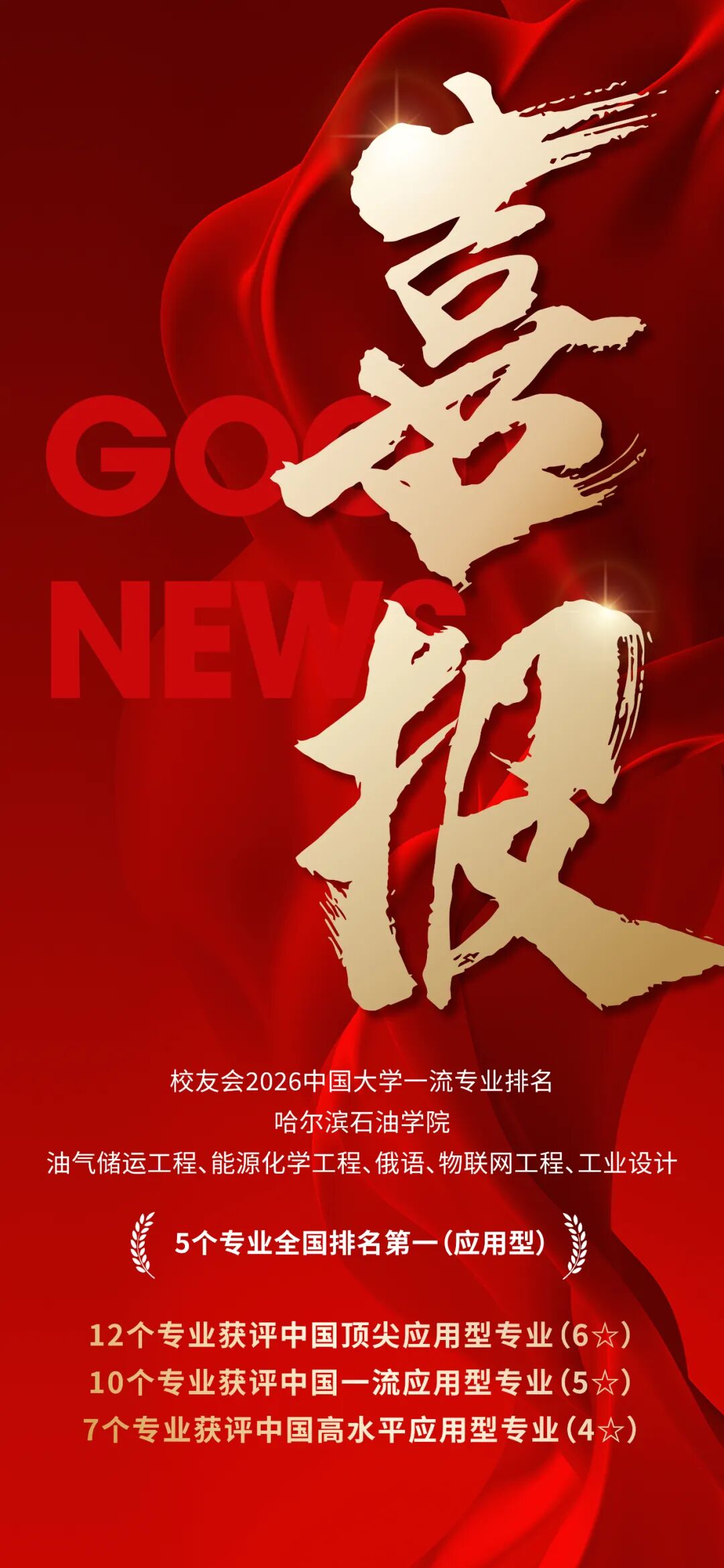 4月13日,全国第三方大学评价机构艾瑞深校友会网(Cuaa.net)正式发布校友会2026中国大学一流专业排名。在这一权威榜单中,哈尔滨石油学院凭借卓越的办学实力与专业建设水平,交出了一份亮眼的成绩单:油气储运工程、能源化学工程、俄语、物联网工程、工业设计5个专业全国排名第一(应用型)!12个专业获评中国顶尖应用型专业(6☆)、10个专业获评中国一流应用型专业(5☆)、7个专业获评中国高水平应用型专业(4☆),充分彰显了哈尔滨石油学院在应用型人才培养领域的广泛影响力。