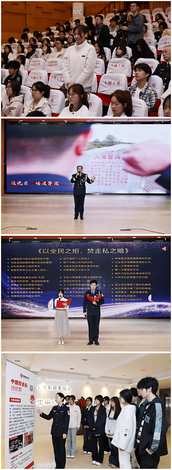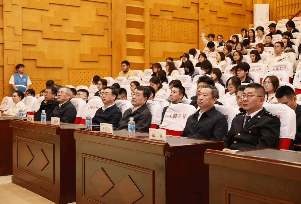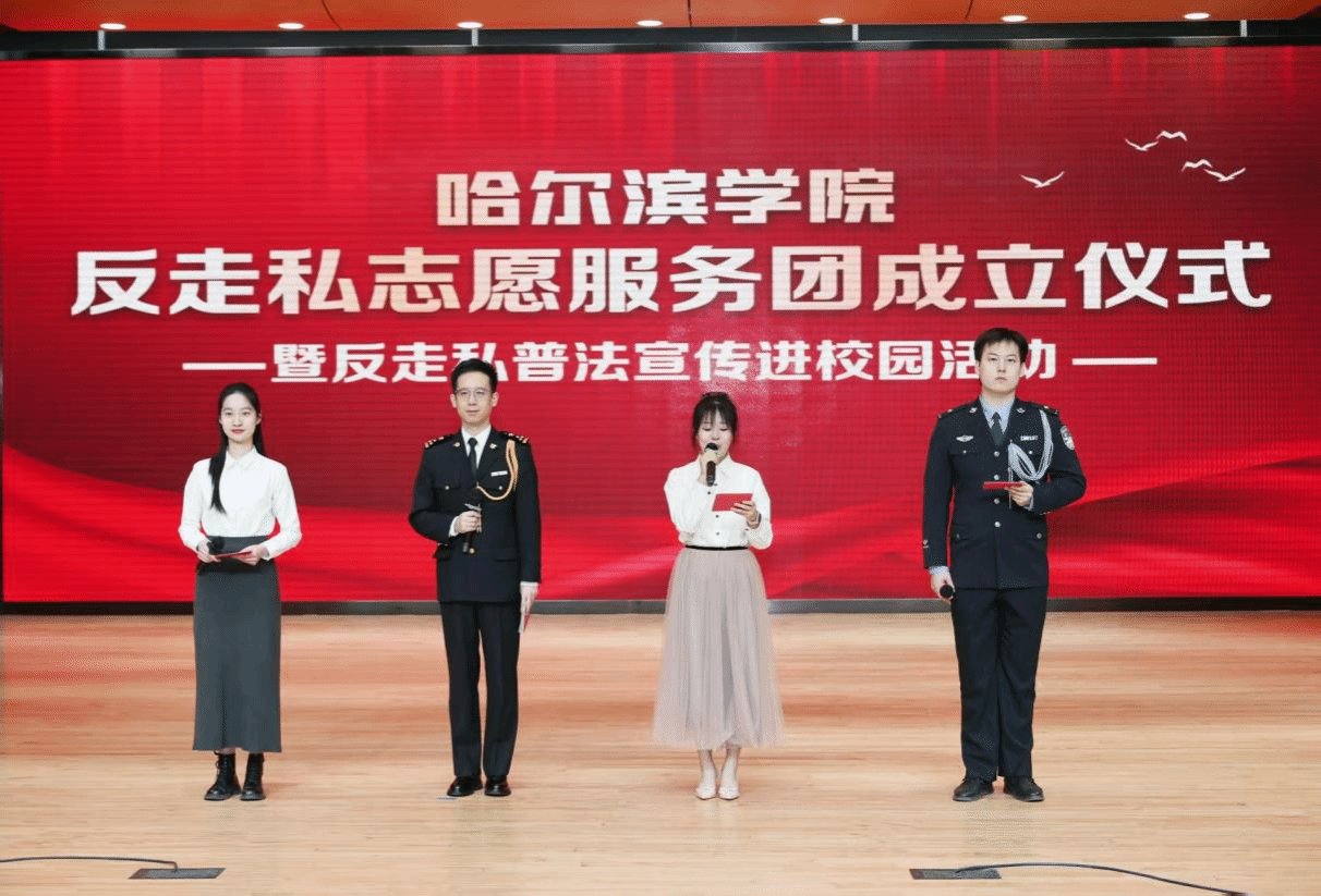 为深入贯彻习近平法治思想,筑牢国门安全防线,切实增强青年学生法治意识与社会责任感,4月15日,哈尔滨学院反走私志愿服务团成立仪式暨反走私宣传进校园活动在学校音乐厅举行。省政府副秘书长牟善学,哈尔滨海关缉私局局长林志兵,省公安厅反恐专员徐景波,校长于成学、副校长吴旭峰出席活动,相关单位负责人及师生代表参加。
