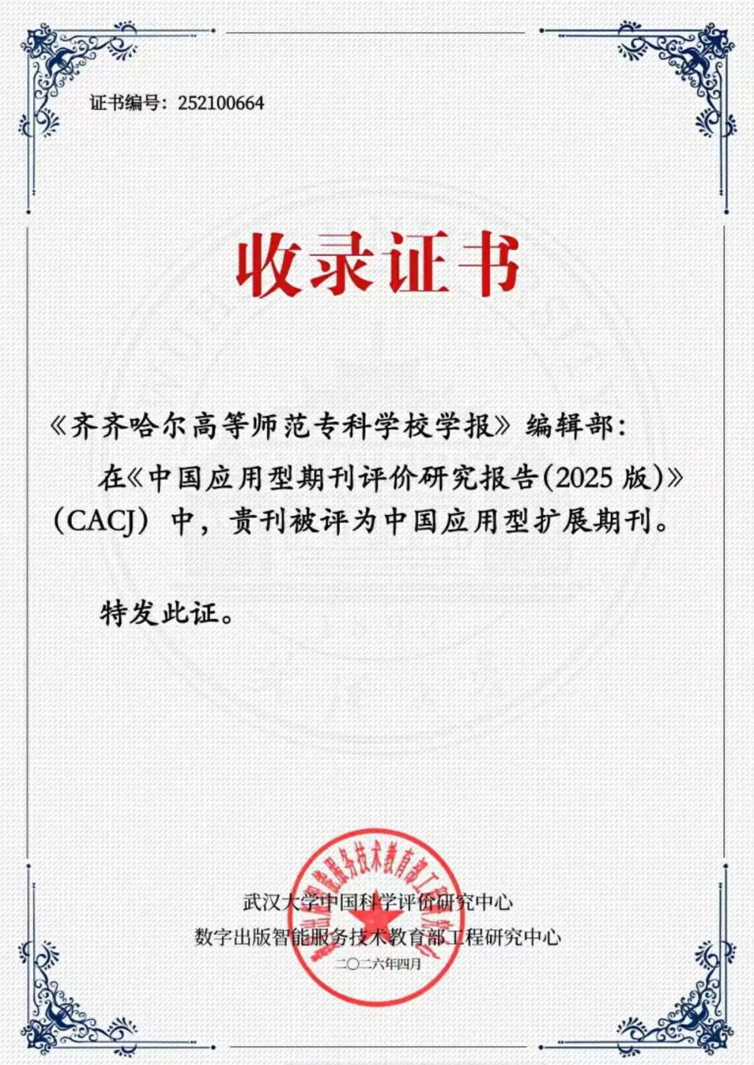 本次入选应用型核心(扩展)期刊,是期刊评价专业部门对学报办刊质量和影响力的高度认可。《齐齐哈尔高等师范专科学校学报》将以此为契机,坚持正确的办刊方向,聚焦高等职业教育领域应用创新和前沿技术,持续提升期刊的传播影响力和内容质量,为学校转型发展和建设区域高水平职业院校作出贡献。