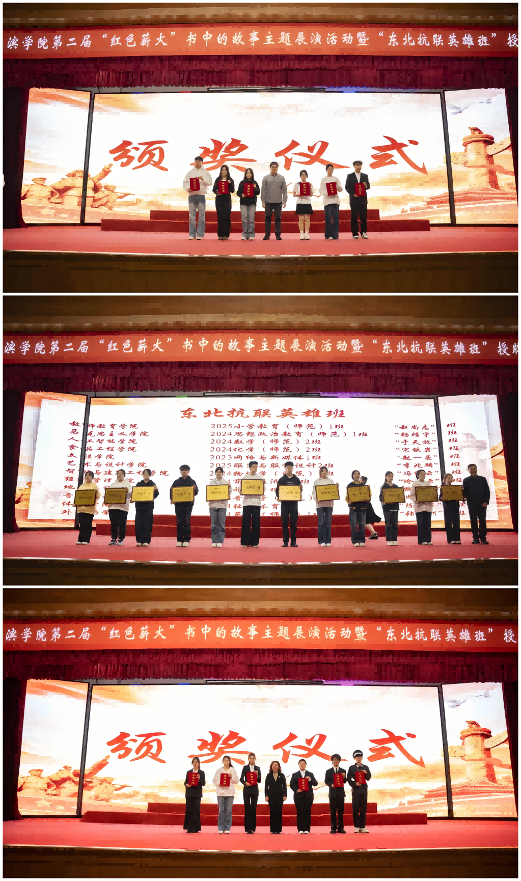 活动中,孙钊为12个“东北抗联英雄班”授牌。李娜为获得一、二、三等奖的展演团队颁奖,潘俊豪为获得优秀奖的展演团队颁奖。