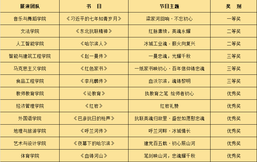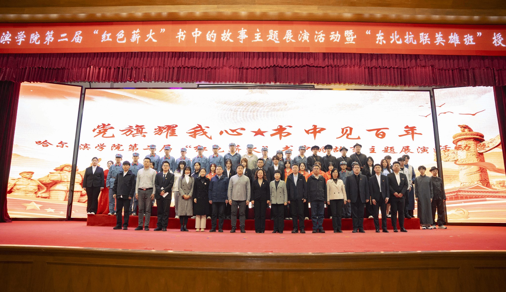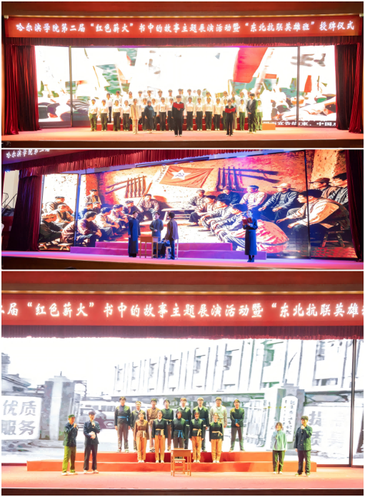 展演环节,来自12个学院的表演团队,以红色经典书目为蓝本,通过戏剧、朗诵、情景讲述等丰富艺术形式,生动再现了百年党史中的感人篇章。节目内容涵盖革命战争年代的烽火记忆、东北抗联英烈的家国情怀、工业建设的奋斗足迹、教育初心的时代回响等多个主题。参演学生以饱满的热情和真挚的演绎,将书本中的文字转化为舞台上可感可学的精神力量,呈现了一堂沉浸式的思政“金课”。