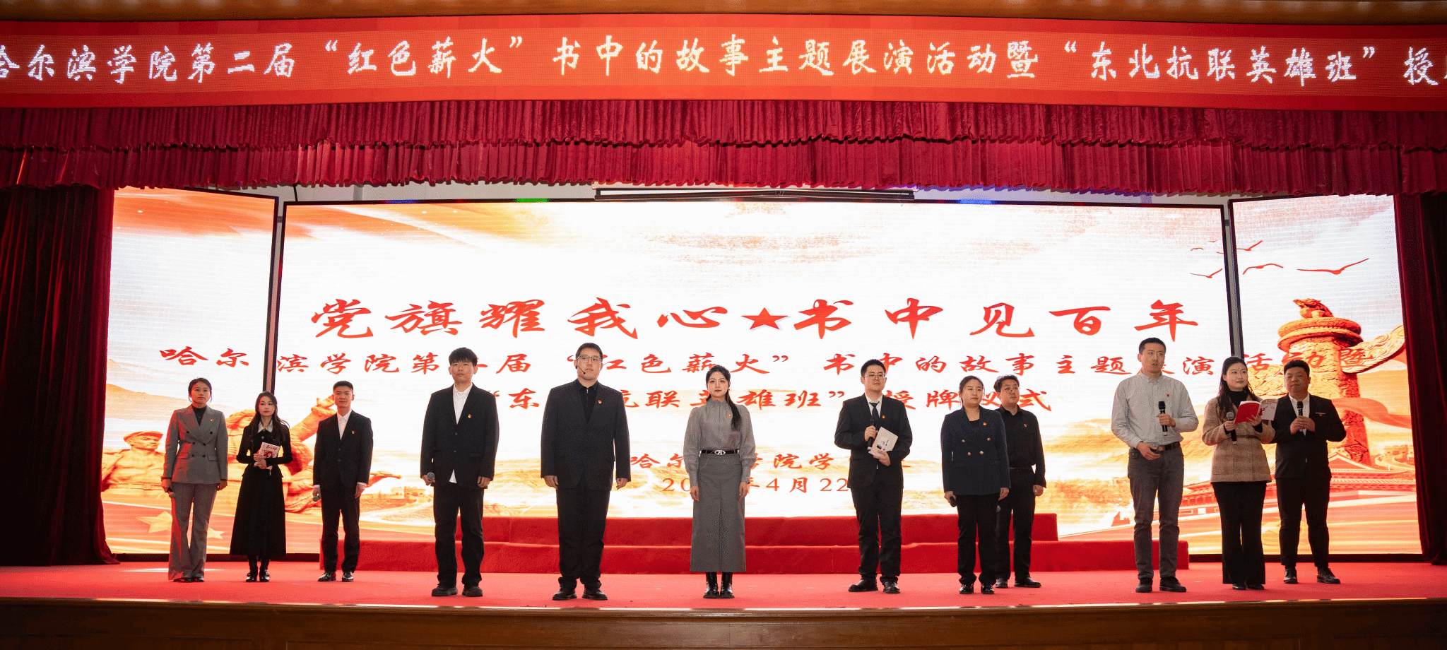 在中国共产党成立105周年、第31个“世界读书日”来临之际,4月22日,学校在图书馆报告厅举行“党旗耀我心 书中见百年”第二届“红色薪火”书中的故事主题展演活动暨“东北抗联英雄班”授牌仪式。校党委书记孙钊、党委副书记李娜、校长助理潘俊豪出席活动。党委组织部、党委宣传部、党委统战部、党政办公室、学生处、教务处等职能部门同志,各二级学院党委(党总支)副书记、全体辅导员及学生代表参加活动。活动特邀纪委办公室、创新创业学院、保卫处、教师教学发展中心、图书馆负责同志担任评委。